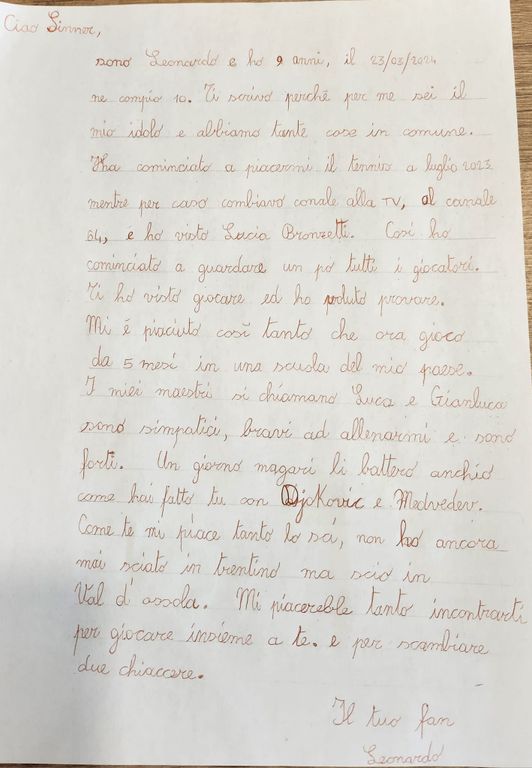 Un amore talmente grande che lo ha spinto a scrivere una lettera al suo idolo raccontandogli della sua passione per il tennis e del suo desiderio di incontrarlo. La lettera è stata inviata ai genitori di Sinner, che gestiscono un rifugio in Trentino, e una copia la tiene Leonardo, sperando di potergliela consegnare di persona. Ma un campione di questo livello chissà quante lettere riceverà, si è chiesto Leonardo, e così con l'aiuto della mamma ha pensato di usare i social per far diventare virale la sua lettera affinché il suo messaggio raggiunga Sinner. E la mamma Erika Cortella ha pubblicato la lettera su Facebook chiedendo aiuto alla rete, con tante condivisioni del post per realizzare il sogno di Leonardo di incontrare il suo idolo.
