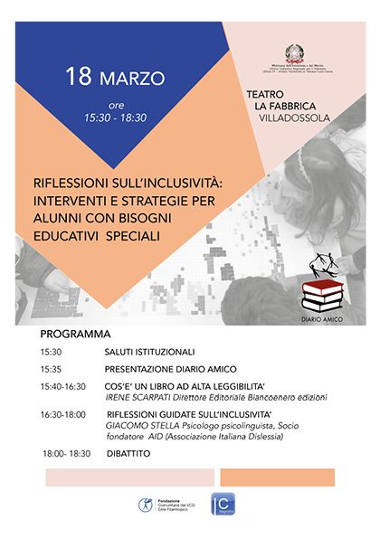Alle ore 15.30 la presentazione del “Diario Amico”. A seguire un intervento di Irene Scarpati, direttrice editoriale di Bianconero Edizioni, che parla di libri ad alta leggibilità. Ospite d’eccezione il professor Giacomo Stella, psicologo psicolinguista, socio fondatore dell'Associazione Italiana Dislessia, e fondatore dei centri Sos Dislessia, presente anche nel Vco presso lo Studio ABC della dottoressa Jennifer Francioli. Il professor Stella nel suo intervento affronterà la tematica delle "Riflessioni guidate sull'inclusività".