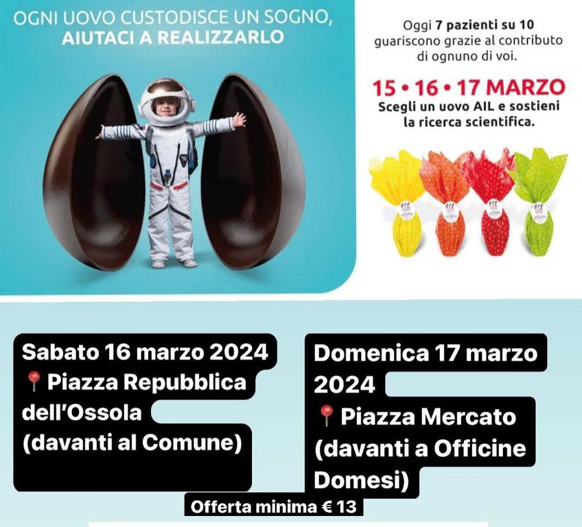 Pasqua all’insegna della solidarietà. Nelle giornate di oggi, sabato 16 e domani, domenica 17 marzo, a Domodossola sarà possibile acquistare un uovo di Pasqua Ail con un contributo di 13 euro che servirà a sostenere la lotta contro leucemie, linfomi e mieloma e a portare aiuto a tanti pazienti. I volontari dell’associazione saranno presenti in Piazza Repubblica dell'Ossola nella giornata di oggi e in Piazza Mercato domani.