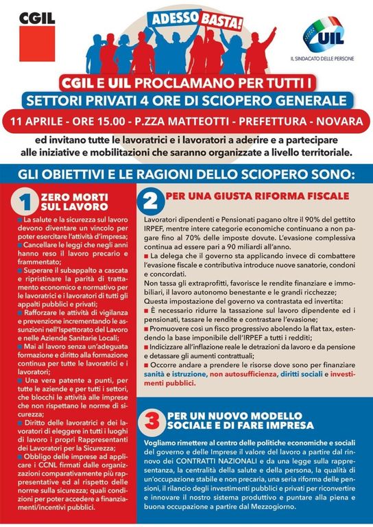 Inoltre, l'11 aprile alle ore 15.00 si terrà a Novara, in piazza Matteotti, un presidio in concomitanza con lo sciopero indetto da Cgil e Uil.