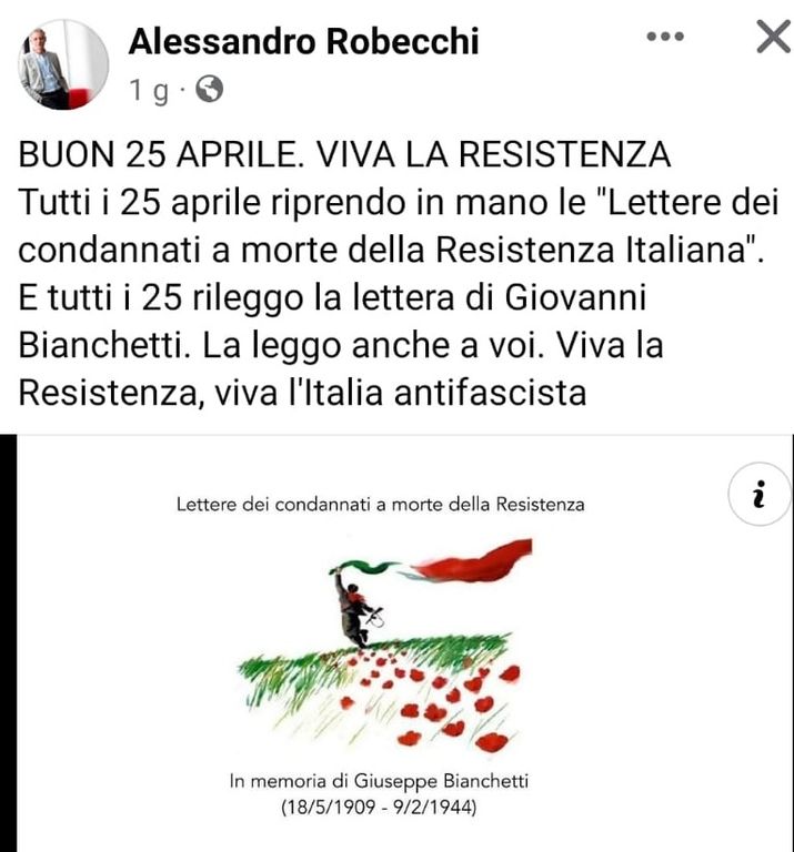 L'intervento sulla Resistenza in occasione del 25 aprile di quest’anno - che si può trovare su You Tube - vede Robecchi leggere proprio la lettera che Bianchetti scrisse su un foglietto di fortuna poche ore prima di essere ucciso. ‘’Tra queste lettere – racconta Robecchi –ne ho adottata una, quella di Giuseppe Bianchetti, che nel 1934 aveva 34 anni. Era un operaio che fu condannato a morte dal tribunale tedesco e fucilato a Novara il 9 febbraio 1944’’.