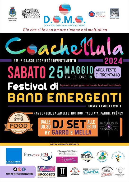 L'associazione Donatori Ossolani Midollo Osseo (D.O.M.O) presenta "Coachellula 2024", un evento musicale dedicato alle band emergenti del territorio, che si terrà sabato 25 maggio 2024 dalle ore 18.00 presso l'area feste di Trontano. Questo festival non è solo un'opportunità per godersi la musica, ma anche per diffondere consapevolezza sull'importanza della donazione di cellule staminali.