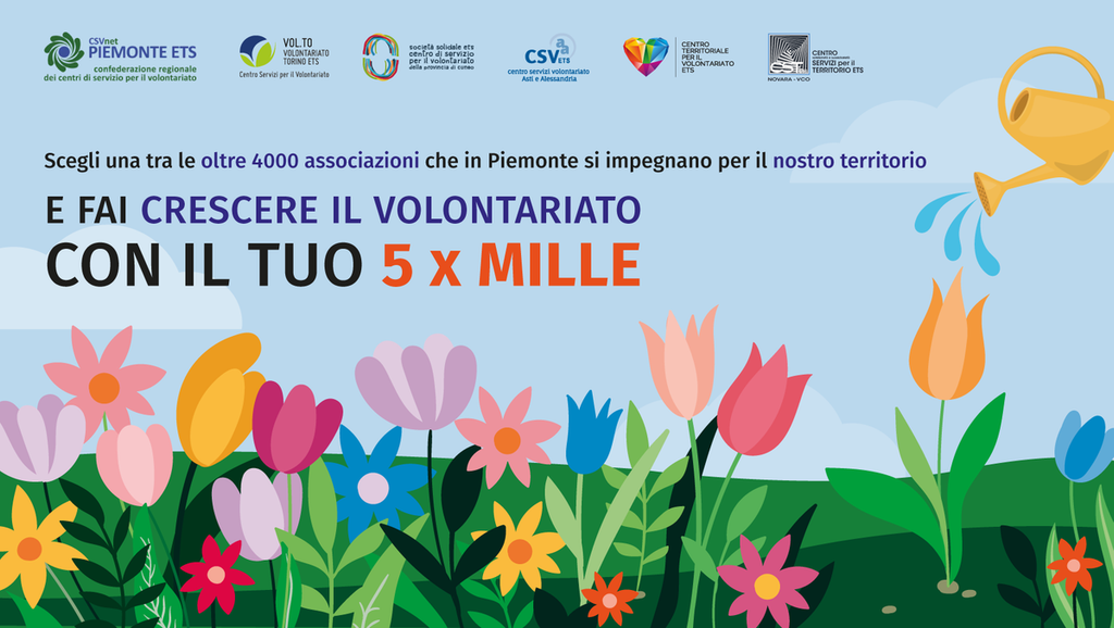 Un prato verde con un mare di fiori colorati e un piccolo innaffiatoio che, con qualche goccia d’acqua, si prende cura di un fiore, aiutandolo a crescere: è questa l’immagine evocativa scelta per una nuova campagna di sensibilizzazione alla donazione del 5x1000 che sarà veicolata su tutto il territorio piemontese a partire da questo mese. A promuoverla è CSVnet Piemonte, la Confederazione che unisce i 5 Centri Servizi Volontariato del Piemonte: Centro Servizi Volontariato Asti Alessandria ETS (CSVAA), Volontariato Torino ETS (VOL.TO), Centro di Servizio per il Volontariato della provincia di Cuneo (Società Solidale CSV Cuneo), Centro Territoriale Volontariato Vercelli – Biella (CTV Biella Vercelli), Centro Solidarietà e Sussidiarietà – Servizi per il Territorio (CST Novara VCO).