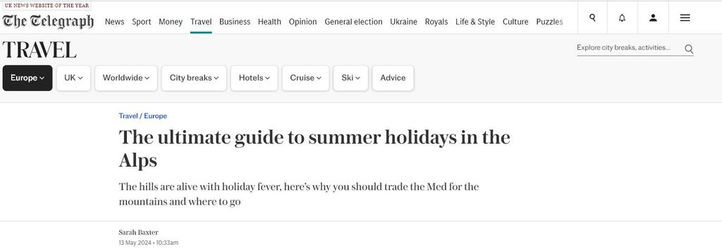 Santa Maria Maggiore sempre più superstar della stampa internazionale: il Telegraph, nella sua versione online, ha dedicato un post alla località vigezzina, inserendola tra le mete da non perdere per l'estate 2024 tra le Alpi. Nel post, a firma di Sarah Baxter pubblicato il 13 maggio, Santa Maria Maggiore viene presentata come un pittoresco paesino che merita già di per sé una visita, ma viene in particolare posto l'accento sulla ricchezza della sua storia e dei suoi musei, da quello degli Spazzacamini alla Casa Museo dedicata all'acqua di Colonia. Il Telegraph consiglia poi un viaggio a bordo della Ferrovia Vigezzina, o un trekking lungo la via del Mercato.