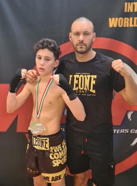Elia Cosentino si è confermato campione italiano di K1 per la terza volta consecutiva, in due circuiti differenti. Nella foto, il coach e padre Luca Cosentino posa con il figlio Elia, il quale ha trionfato nella semifinale del campionato nazionale WBFC contro un avversario di 5 kg più pesante e successivamente ha vinto la finale contro il forte rumeno Kevin Hurdubaia. Nonostante un infortunio, Elia ha dimostrato grande cuore, tecnica e determinazione, conquistando ancora una volta il titolo.
