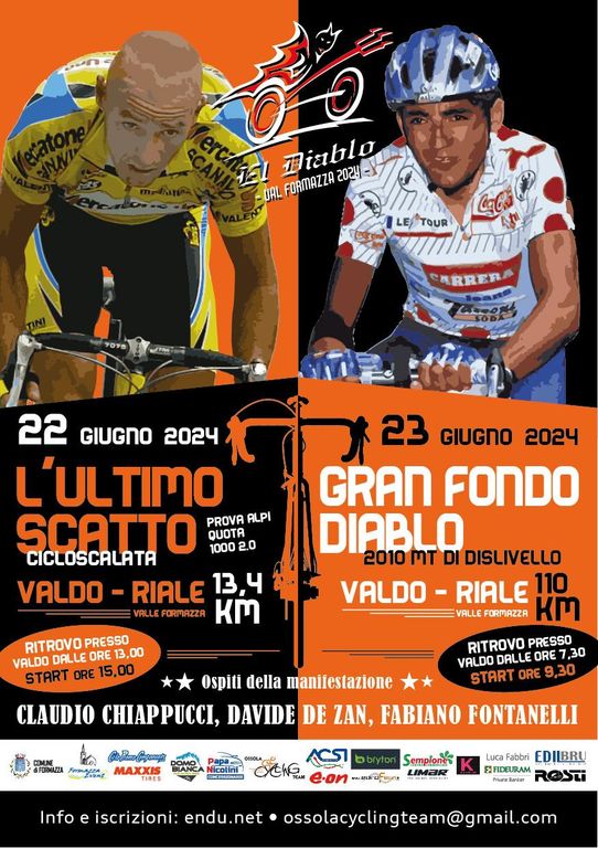 L’Ossola Cycling Team ha annunciato il ritorno della storica "Gran Fondo Diablo", una manifestazione ciclistica che ha segnato il territorio ossolano. Il 22 e 23 giugno 2024, i ciclisti amatoriali avranno l'opportunità di partecipare a un evento che celebra non solo lo sport, ma anche la bellezza e la storia della Val d'Ossola.