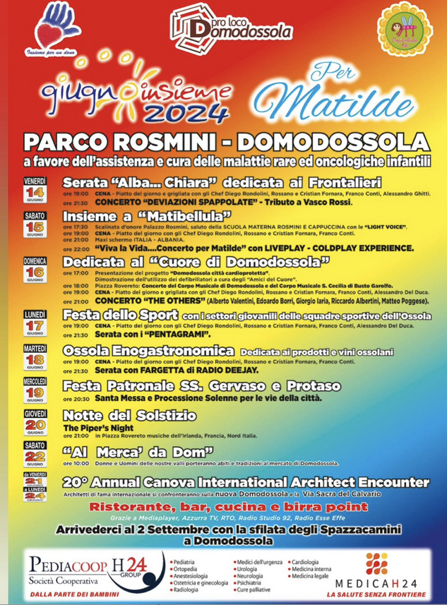 La Pro Loco di Domodossola, in collaborazione con Insieme per un dono e Matibetulla e il sostegno di Pediacoop 24 ha predisposto un ricco programma di iniziative che si svolgeranno dal 14 al 24 giugno. Il Giugno insieme 2024, come da tradizione, farà da corollario ai festeggiamenti per la Festa Patronale dei Santi Gervaso e Protaso, e i proventi della manifestazione saranno devoluti a favore dell'assistenza e cura delle malattie rare ed oncologiche infantili.