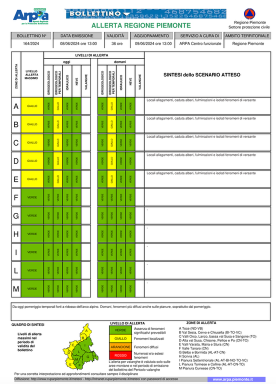 Alla luce della situazione prevista il Centro Funzionale ha emesso un allerta gialla per oggi e domani sui settori alpini. Con l'aggiornamento delle previsioni meteorologiche di domani verrà rivalutata la situazione per il pomeriggio di domenica sulle restanti zone.