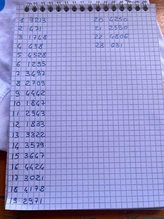 Di seguito forniamo i numeri vincenti della lotteria: 1 – 3213; 2 – 471; 3 – 1748; 4 – 458; 5 – 4528; 6 – 1295; 7 – 3497; 8 – 2709; 9 – 4442; 10 – 1847; 11 – 2943; 12 – 1833; 13 – 3322; 14 – 3579; 15 – 3647: 16 – 4424; 17 – 3021; 18 – 4172; 19 – 2971; 20 – 4250; 21 – 2590; 22 – 4806; 23 – 631