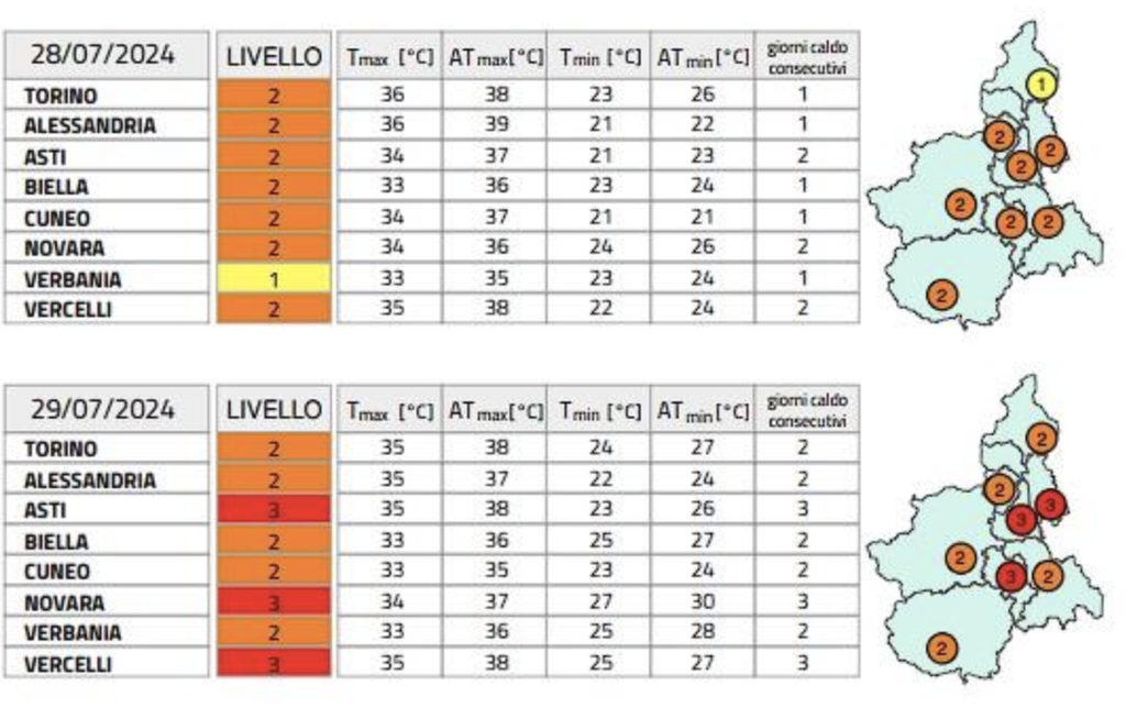 I bollettini emessi nella giornata odierna contengono una previsione di Moderato Disagio (livello 2 – Arancione) per la Città di Torino ed Area Metropolitana per domenica 28 e lunedì 29 luglio, una previsione di moderato disagio sul Bollettino Regionale per domenica 28 luglio ad eccezione della città di Verbania e di Moderato Disagio diffuso per lunedì 29 luglio quando è atteso un livello 3 di Forte Disagio per le città di Asti, Novara e Vercelli.