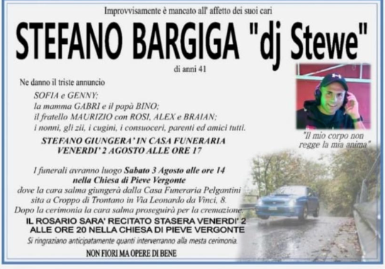 Saranno celebrati domani, sabato 3 agosto, i funerali di Stefano Bargiga, l’operaio di 41 anni che ha perso la vita lunedì 29 luglio in un incidente sul lavoro a Pieve Vergonte.