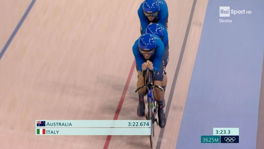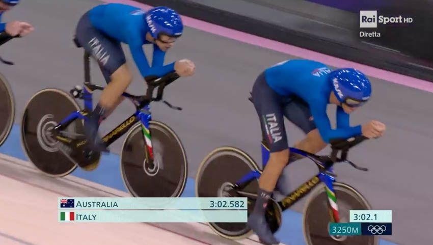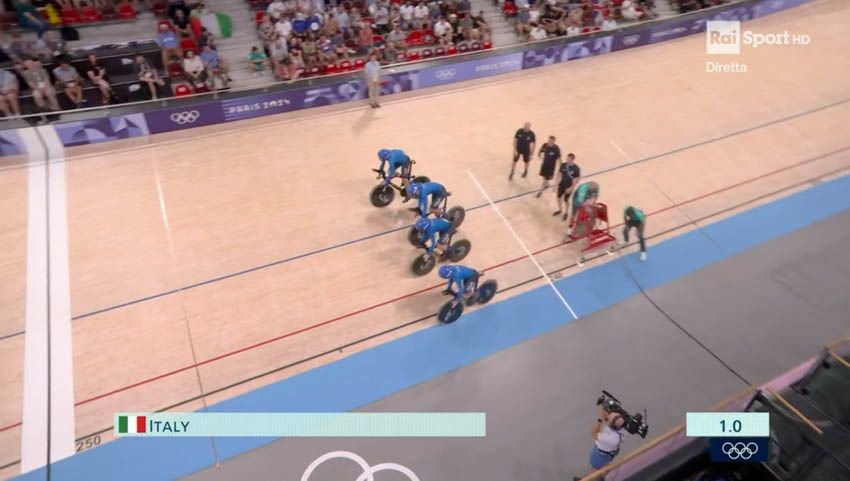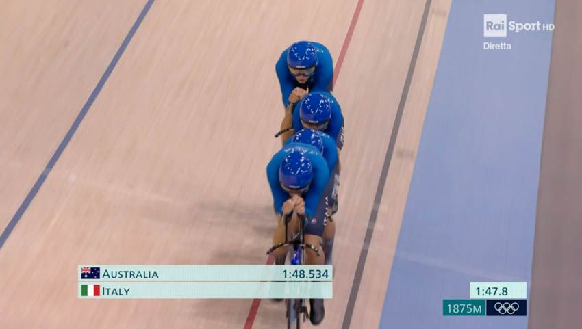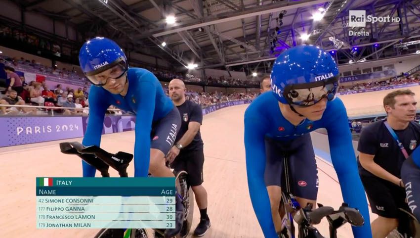 Al Velodromo di Saint-Quentin-en-Yvelines, casa del ciclismo su pista, il quartetto formato da Filippo Ganna, Jonathan Milan, Simone Consonni e Francesco Lamon segna il quarto tempo nella fase di qualificazione (3:44.351) e accede alle semifinali. Gli azzurri vogliono confermare quell'oro conquistato alle passate Olimpiadi. L'avversaria domani sarà l'Australia, che timbra il miglior crono in 3:42.958. Nell'altra semifinale si sfideranno la Gran Bretagna (3:43.241) e la Danimarca (3:43.690).
