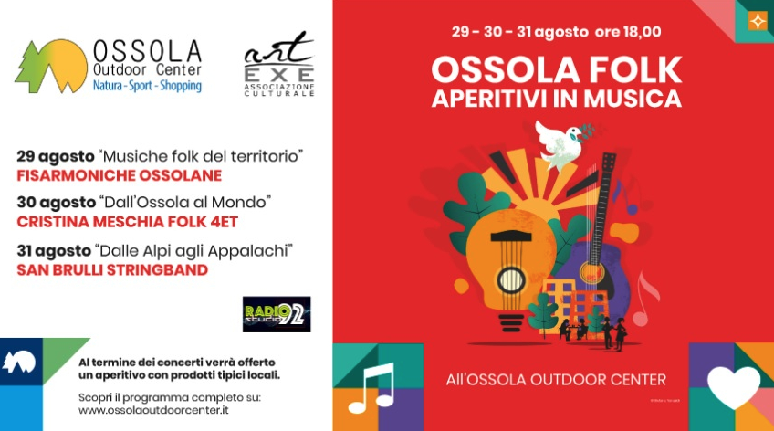 Crevoladossola si prepara a vivere tre serate all’Ossola Outdoor Center, dove dal 29 al 31 agosto la musica folk celebrerà le tradizioni e la cultura del territorio. L’evento, organizzato dall’Associazione Culturale Art Exe in collaborazione con l’Ossola Outdoor Center, offrirà al pubblico un programma ricco di performance dal vivo e gustosi aperitivi.