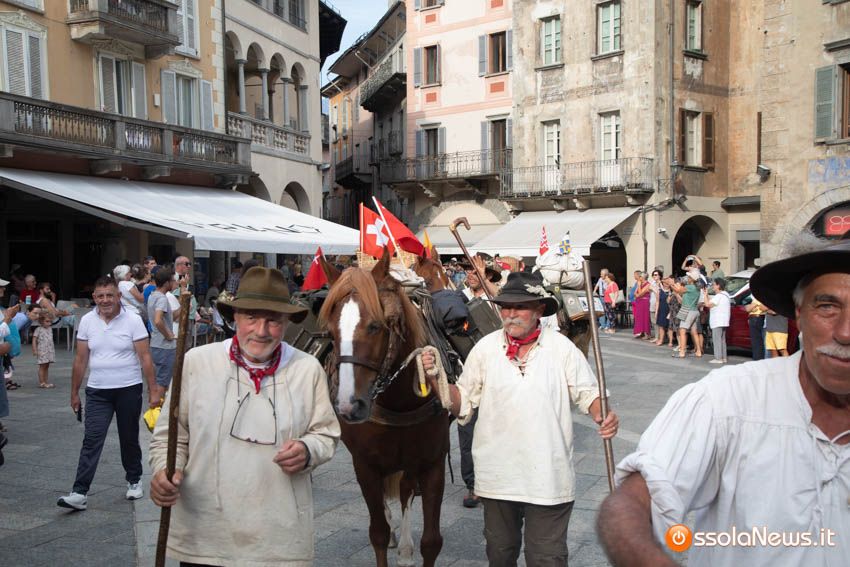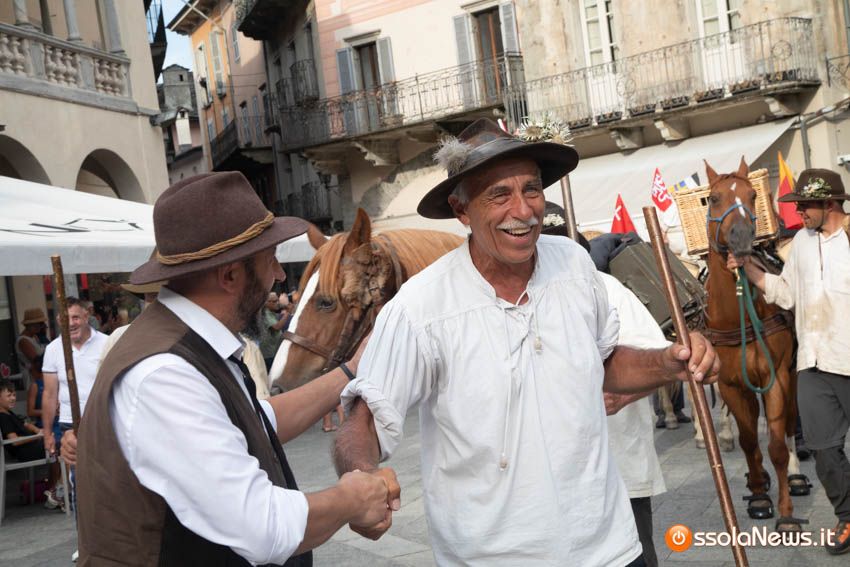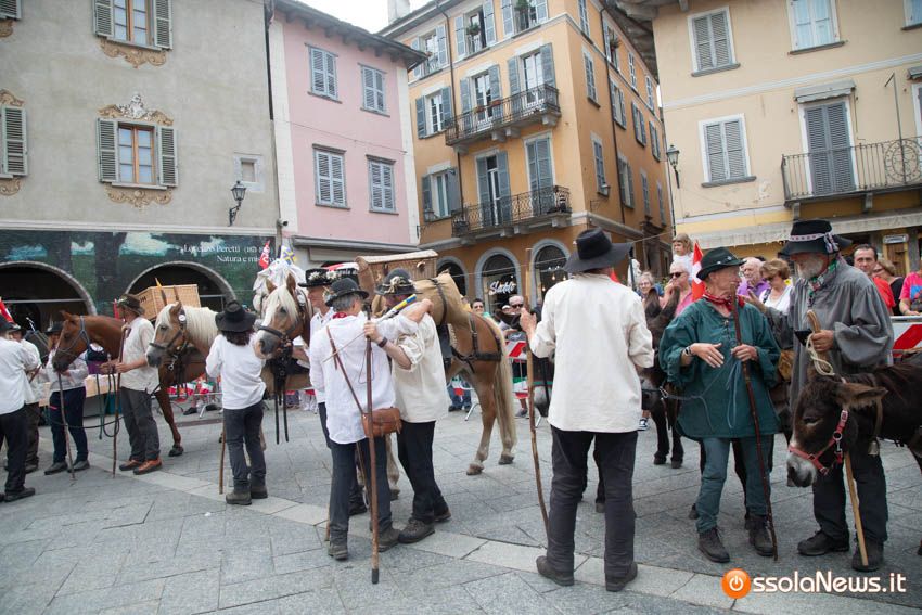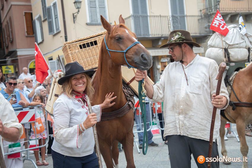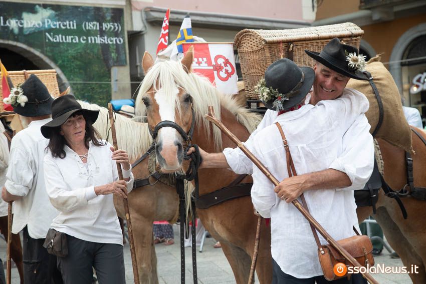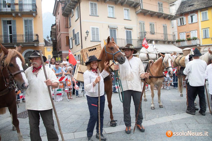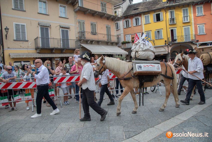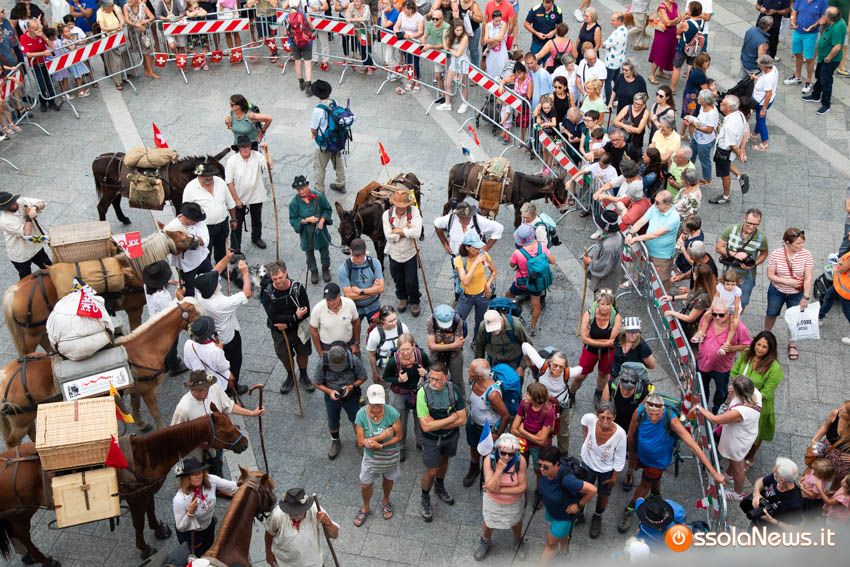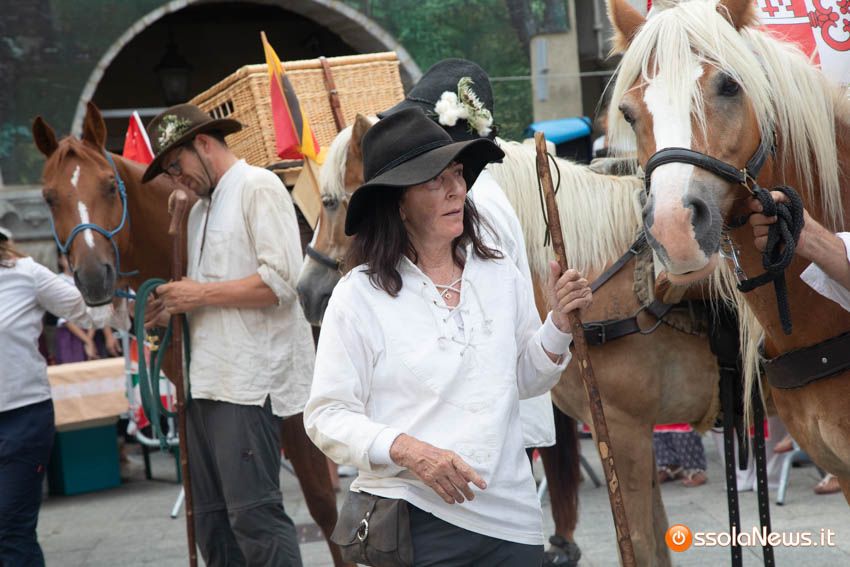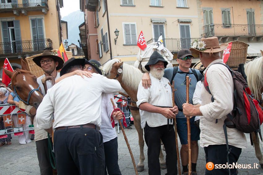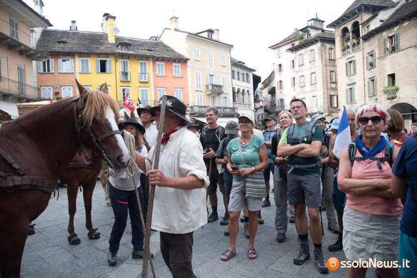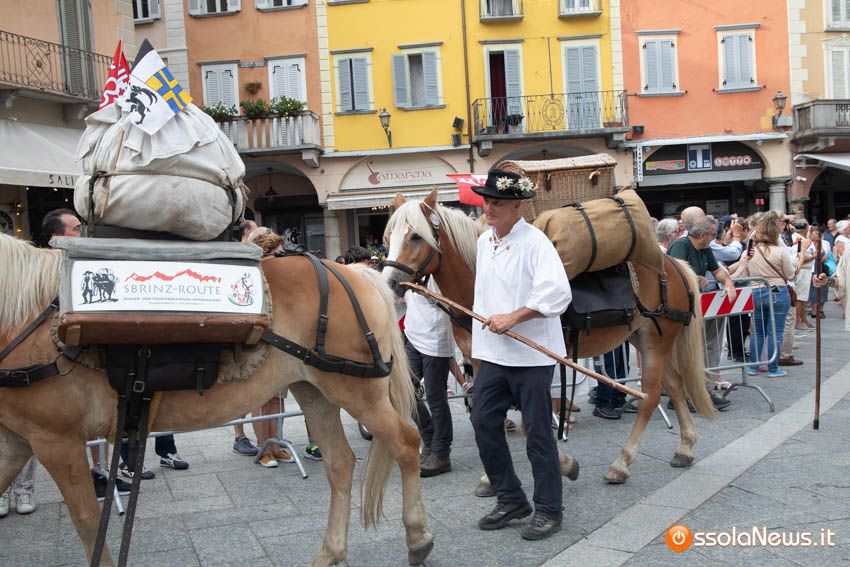 Ha fatto il suo ingresso in piazza Mercato puntuale, alle 18, accompagnata dalle donne dei gruppi folkoloristici di Calice, Vagna e Domodossola la carovana storica della Sbintz Route. Dieci someggiatori in abiti storici con cavalli e muli, e una cinquantina di camminatori a piedi, che da Lucerna camminando per sentieri di montagna in una settimana hanno attraversato le Alpi per giungere a Domodossola.