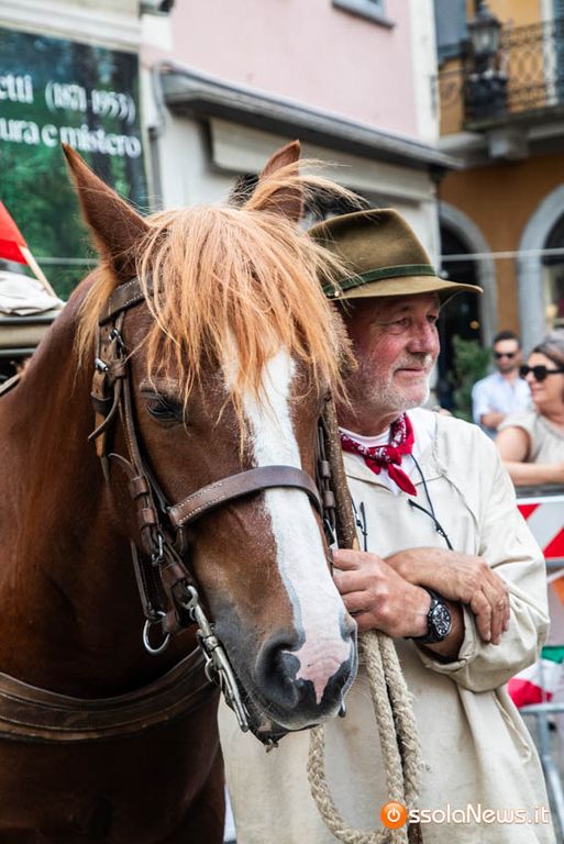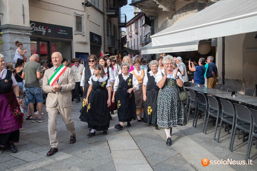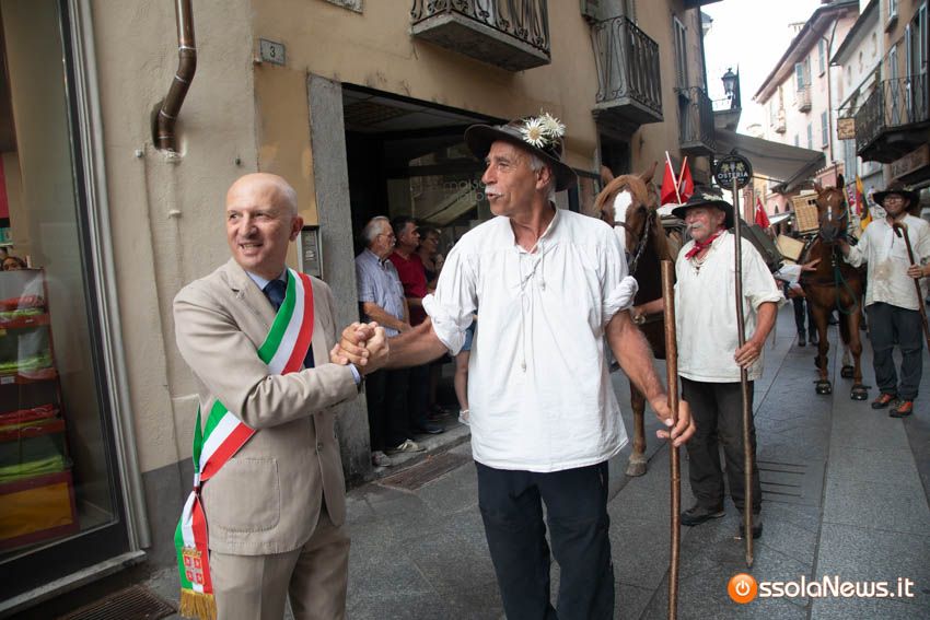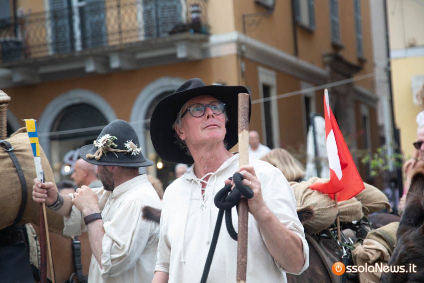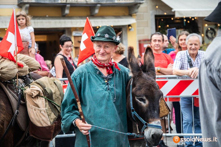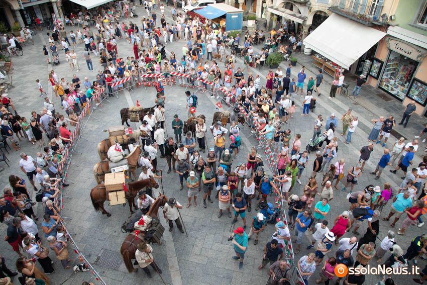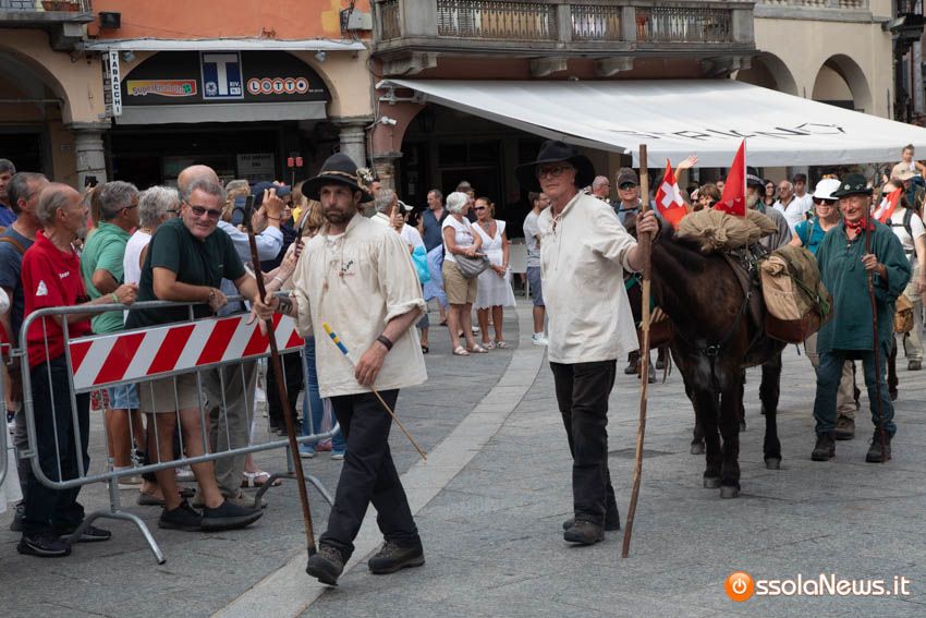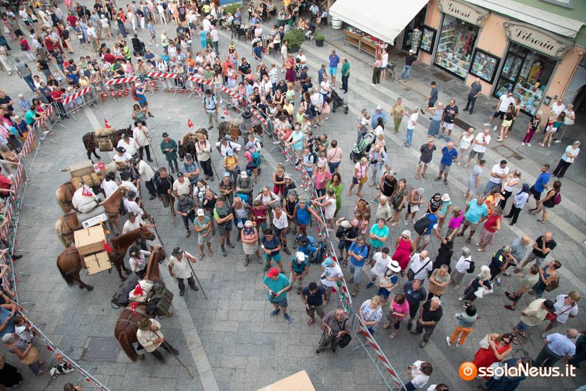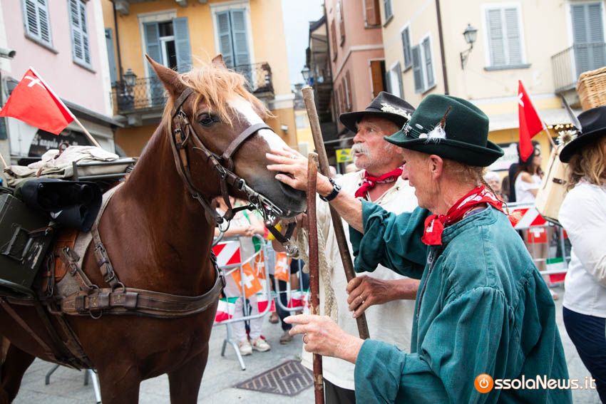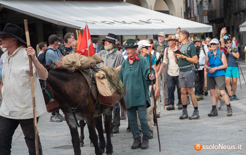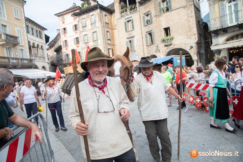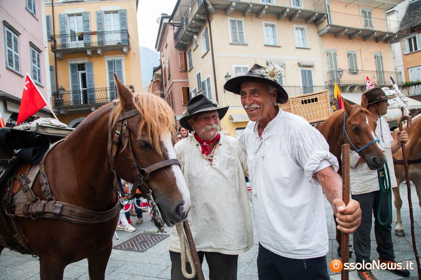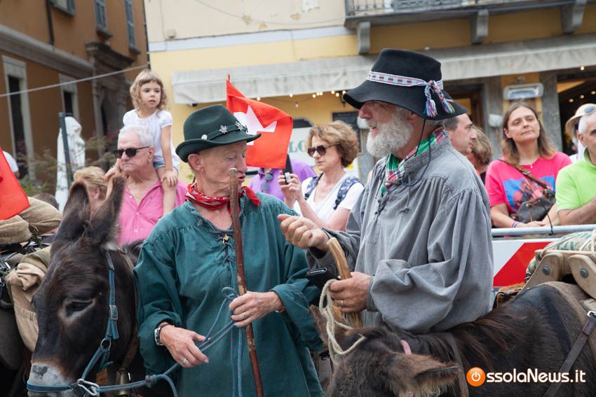 Ha fatto il suo ingresso in piazza Mercato puntuale, alle 18, accompagnata dalle donne dei gruppi folkoloristici di Calice, Vagna e Domodossola la carovana storica della Sbintz Route. Dieci someggiatori in abiti storici con cavalli e muli, e una cinquantina di camminatori a piedi, che da Lucerna camminando per sentieri di montagna in una settimana hanno attraversato le Alpi per giungere a Domodossola.
