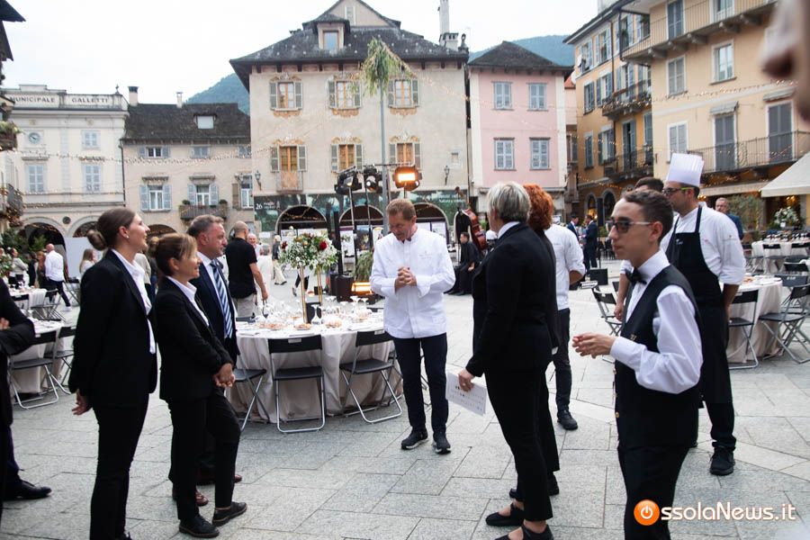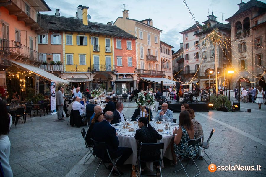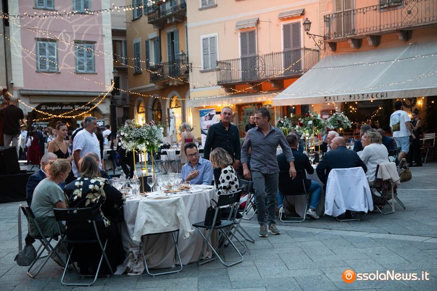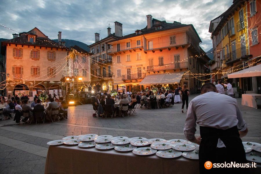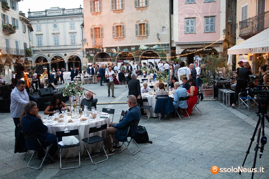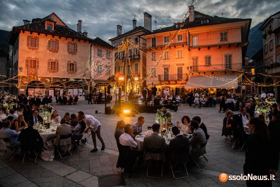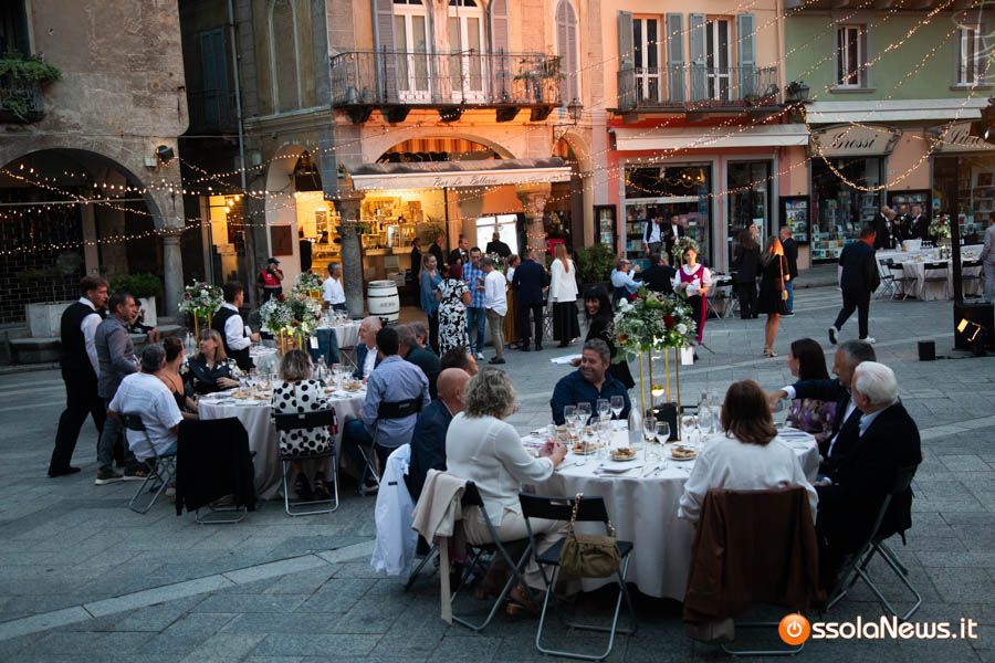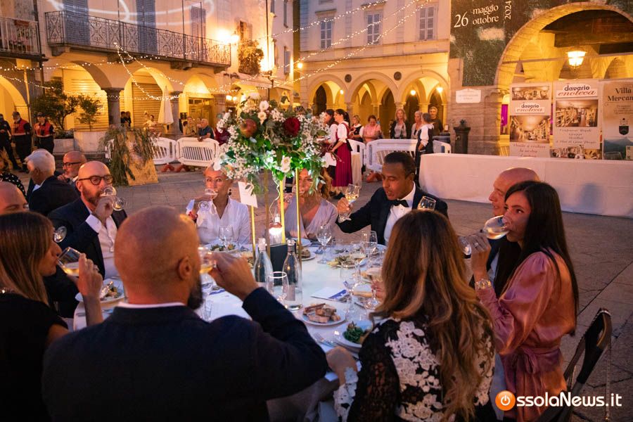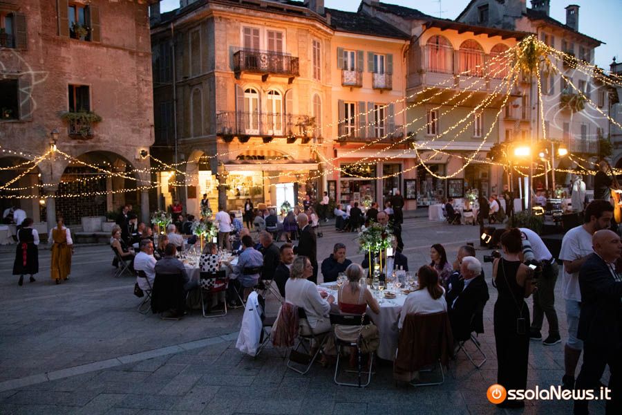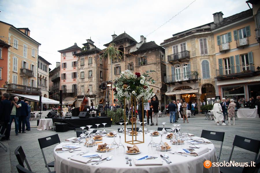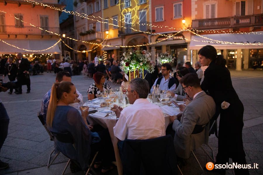 I tavoli tondi vestiti di bianco e finemente apparecchiati, le ombre della sera che si allungano e le calde luci che infiammano i palazzi medievali della piazza. Poco per volta i commensali, i fortunati che sono riusciti ad acquistare un ticket d'ingresso vuoi perché hanno potuto permetterselo vuoi perché i posti sono andati esauriti in pochi giorni, che fanno il loro ingresso eleganti e sorridenti.