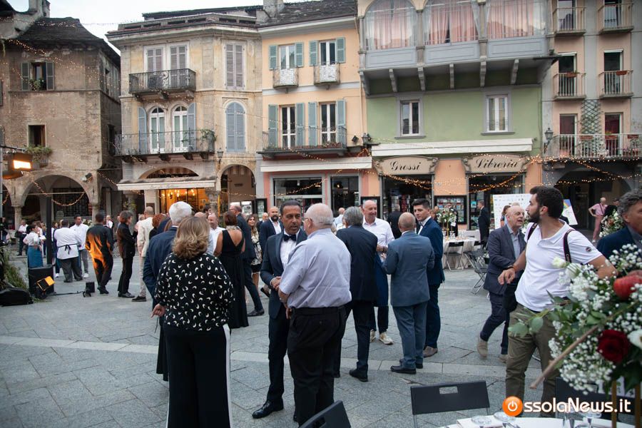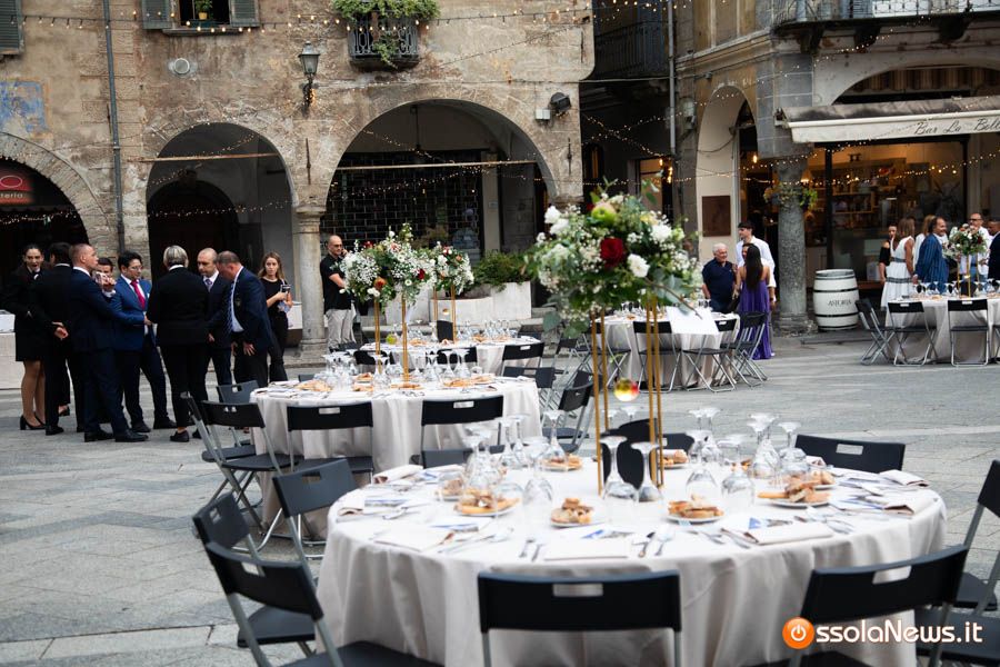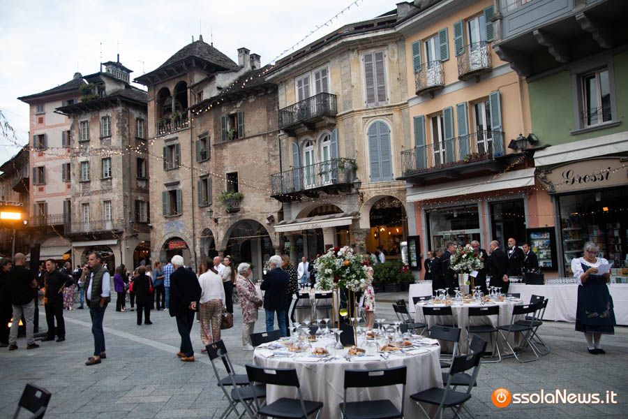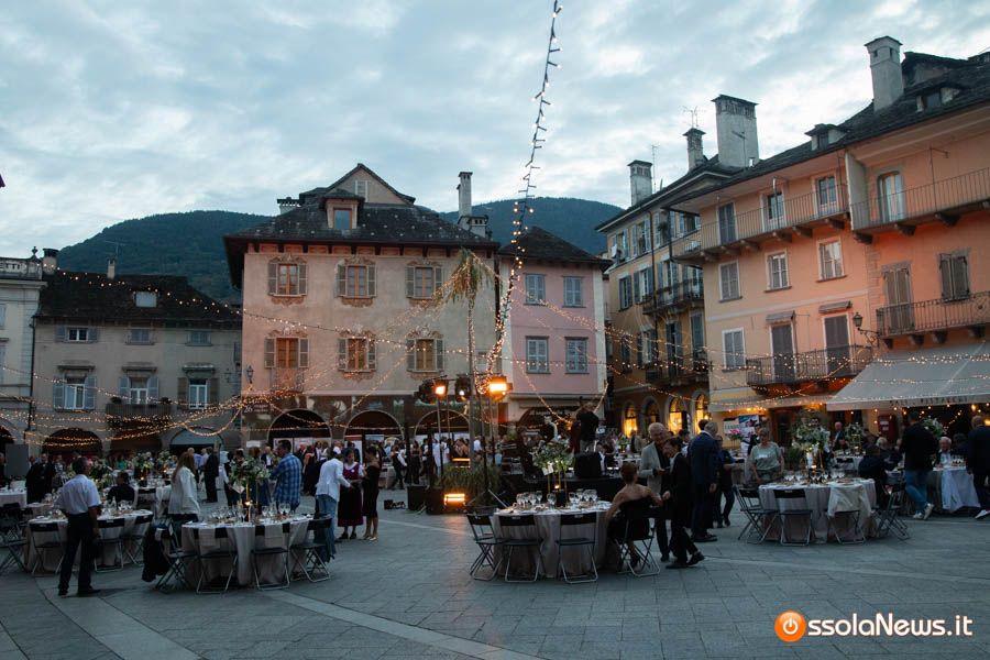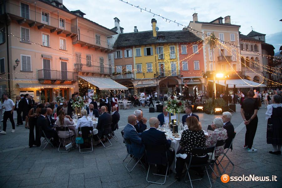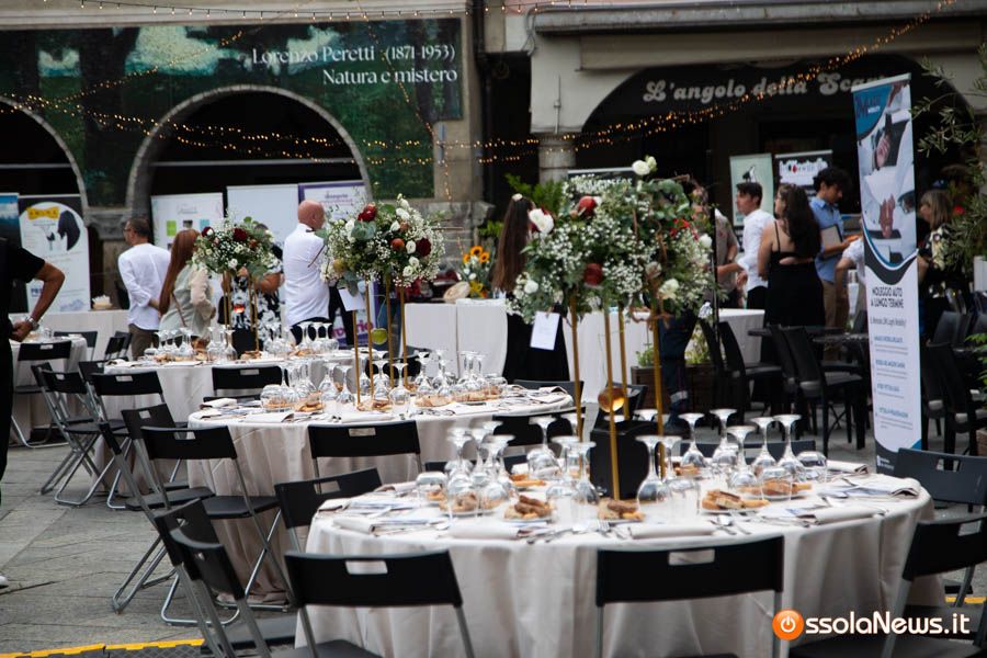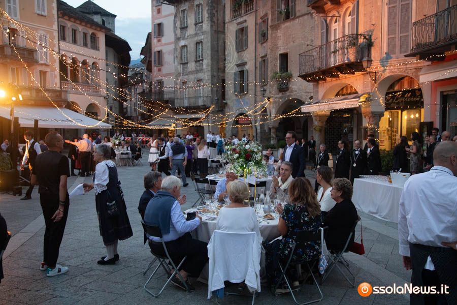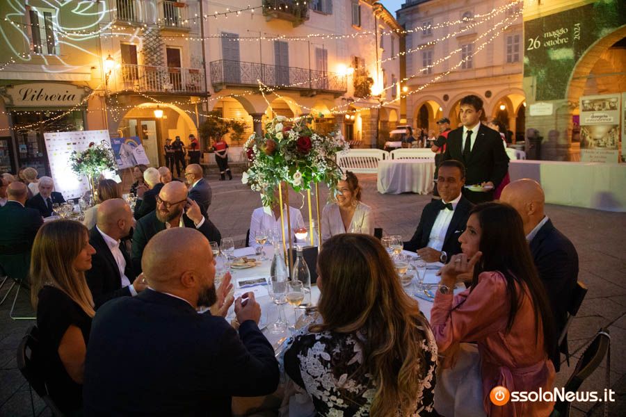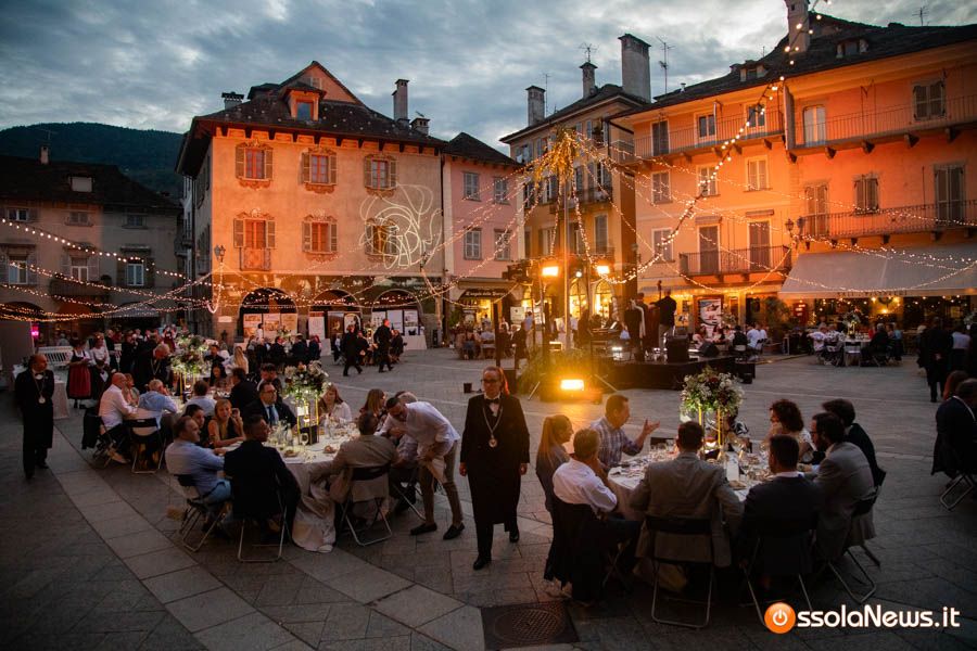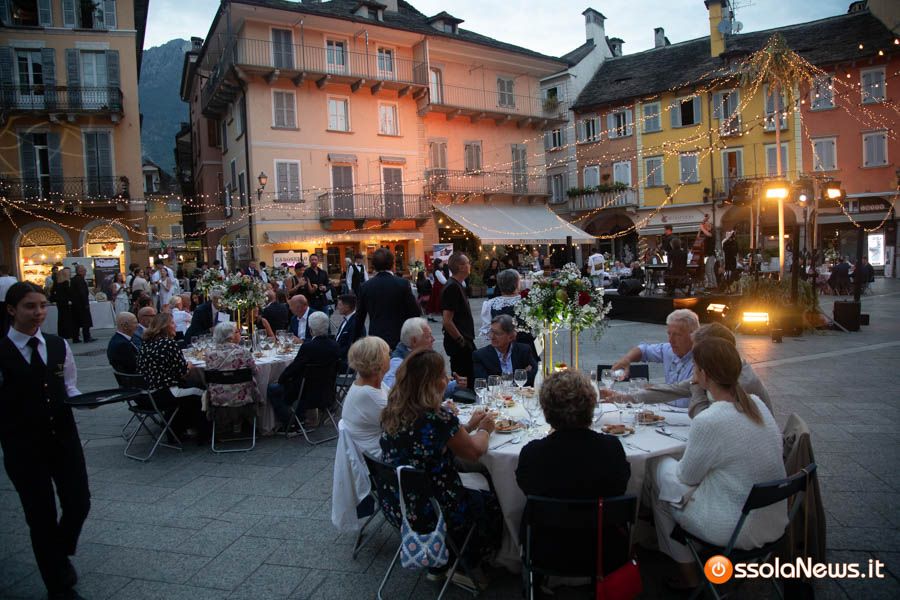 I tavoli tondi vestiti di bianco e finemente apparecchiati, le ombre della sera che si allungano e le calde luci che infiammano i palazzi medievali della piazza. Poco per volta i commensali, i fortunati che sono riusciti ad acquistare un ticket d'ingresso vuoi perché hanno potuto permetterselo vuoi perché i posti sono andati esauriti in pochi giorni, che fanno il loro ingresso eleganti e sorridenti.