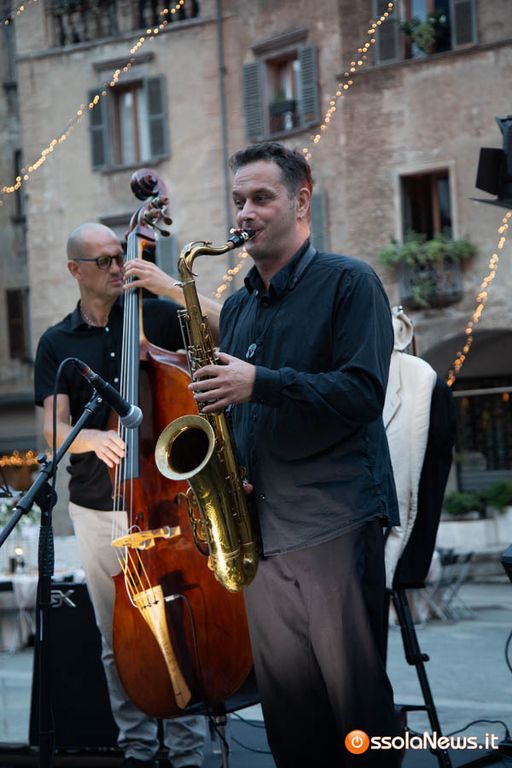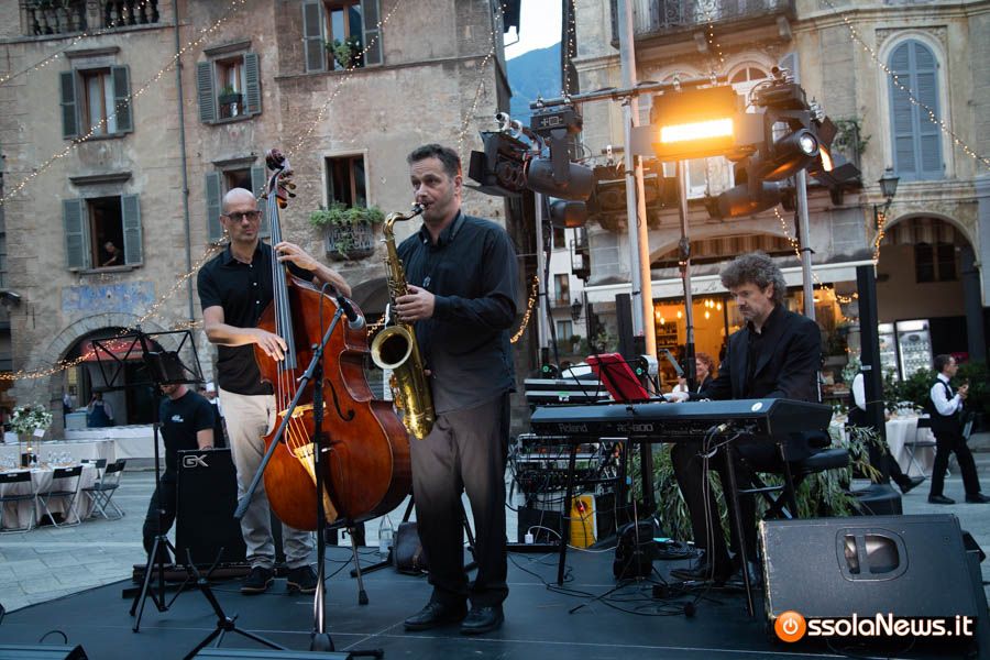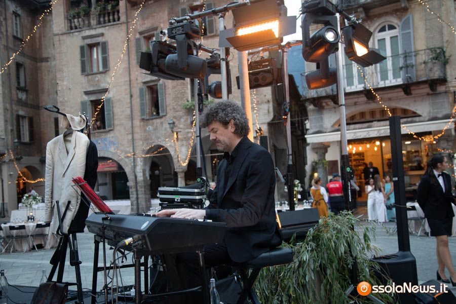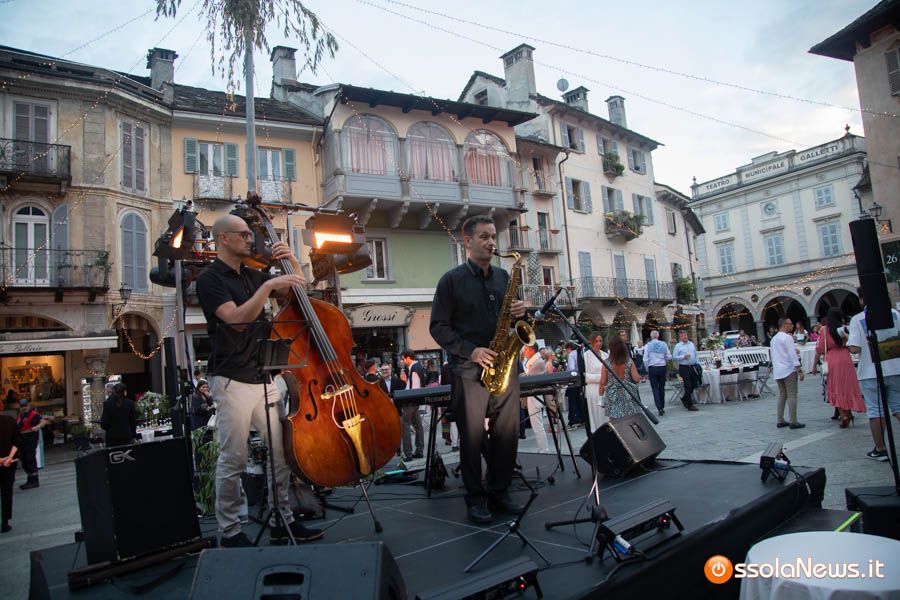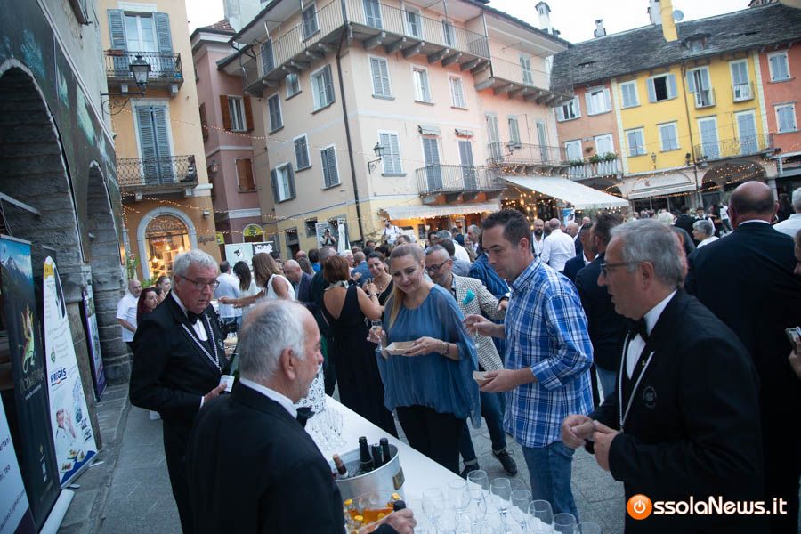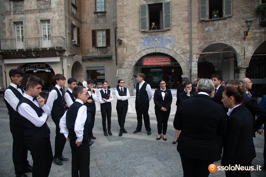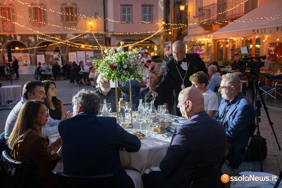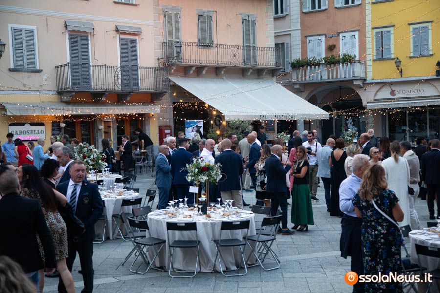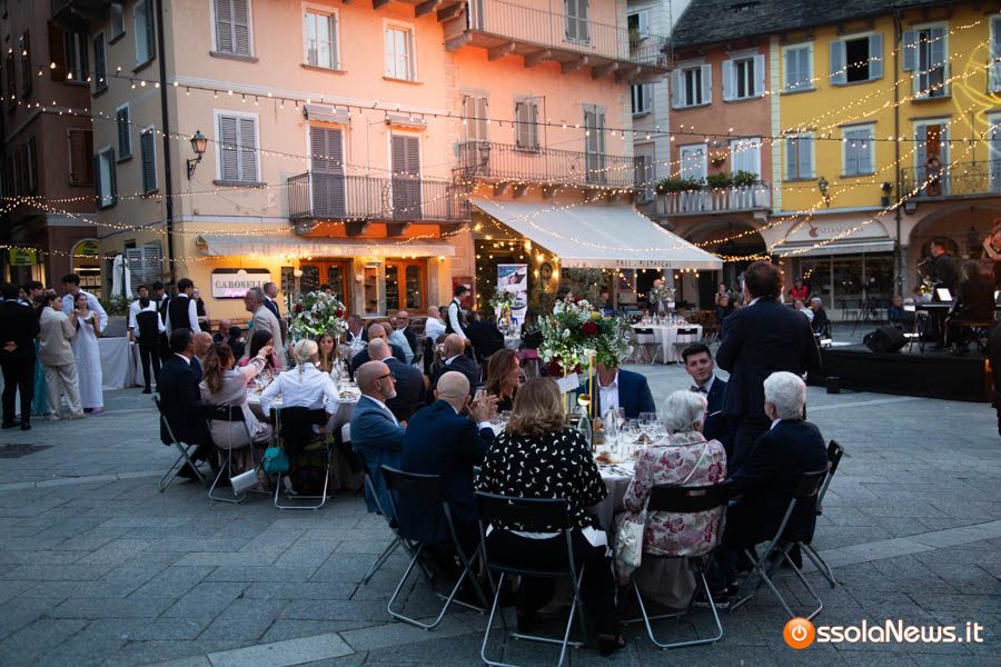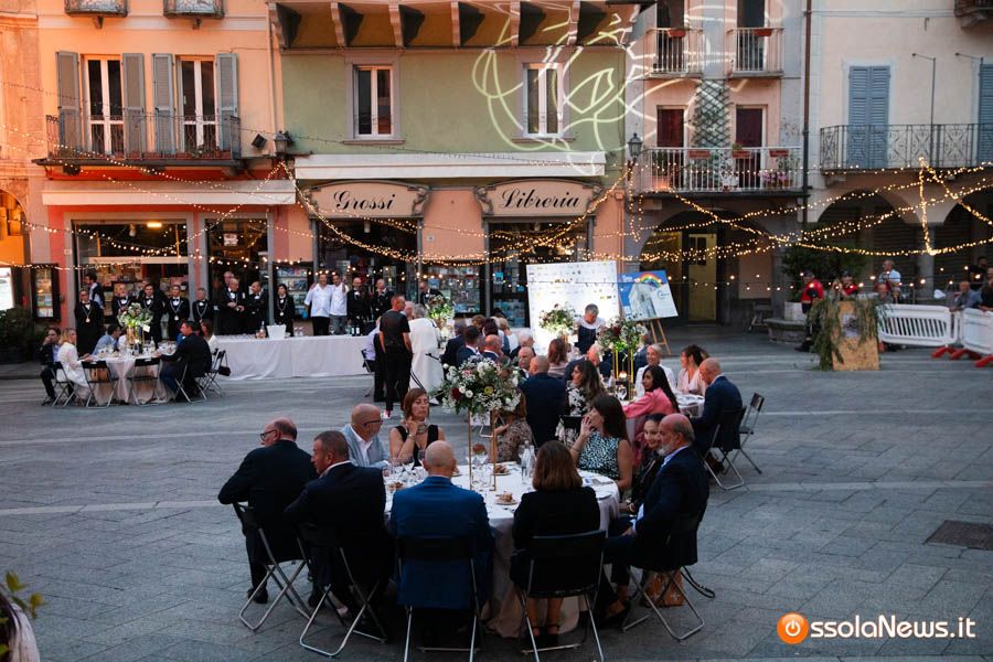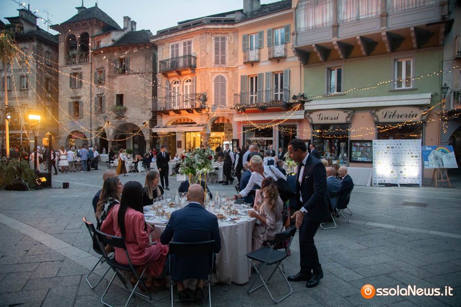 I tavoli tondi vestiti di bianco e finemente apparecchiati, le ombre della sera che si allungano e le calde luci che infiammano i palazzi medievali della piazza. Poco per volta i commensali, i fortunati che sono riusciti ad acquistare un ticket d'ingresso vuoi perché hanno potuto permetterselo vuoi perché i posti sono andati esauriti in pochi giorni, che fanno il loro ingresso eleganti e sorridenti.