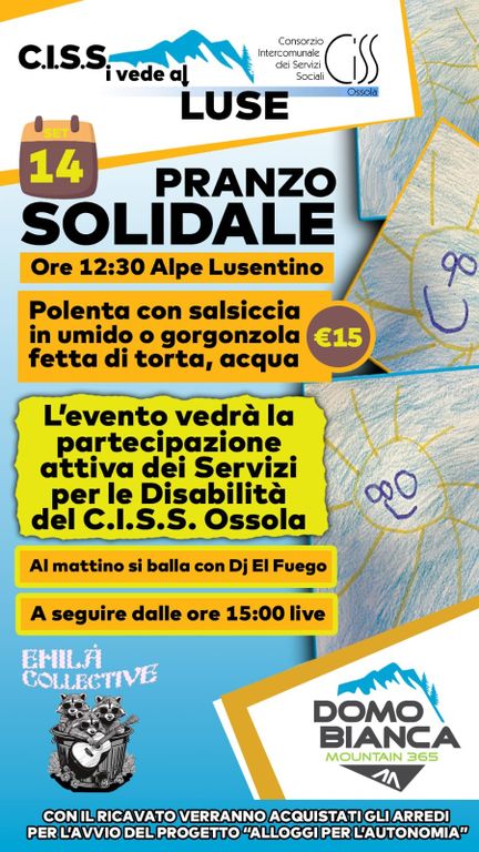 Sabato 14 settembre pranzo solidale a Domobianca365 con la partecipazione attiva dei Servizi per le Disabilità del C.I.S.S. Ossola. La preparazione del pranzo e il servizio al tavolo, contestualmente alla gestione del bar, sarà a cura dei ragazzi con disabilità coordinati dagli operatori del C.I.S.S. Ossola. L’evento si terrà all’Alpe Lusentino nella giornata di sabato 14 settembre con il seguente programma:pranzo a partire dalle ore 12:30 con l’accompagnamento musicale del DJ El Fuego, a seguire, dalle ore 15.00 musica dal vivo con la band Ehilà Collective.