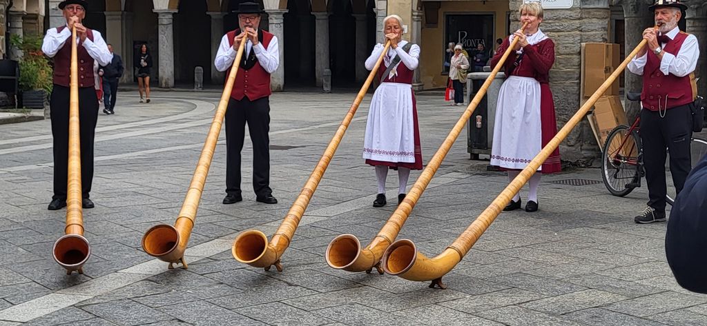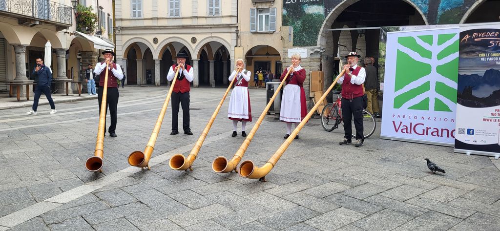 Oggi, infatti, si è celebrata l'annuale iniziativa "Parchi in città" e negli stand posizionati sino alle 14.00 in piazza Mercato hanno messo a disposizione cartine, libri e molto altro materiale informativo per far conoscere le bellezze di questi luoghi. Ad attirare l'attenzione del pubblico è stata anche e soprattutto la presenza di cinque corni delle Alpi provenienti dal Vallese, gli Alpenhorn. Suonati da cinque musicisti con gli abiti tradizionali della zona del Binntal, hanno regalato un intermezzo inaspettato che, in questa giornata uggiosa, ha rallegrato il pigro passeggio della domenica mattina.