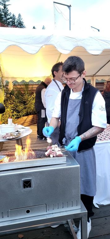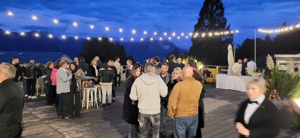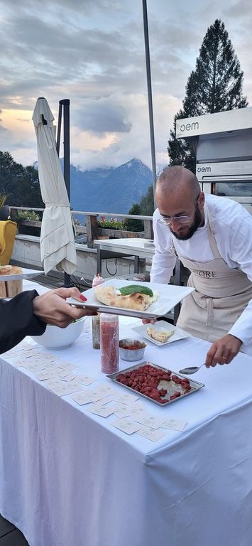 Il viaggio di Chef in quota è iniziato con l'aperitivo in terrazza, in una serata inaspettatamente mite ammirando il tramonto sulla vallata ossolana: le pizze di Pasquale Petrillo di Fiore di Latte, il Bettelmat di Gianluca Barp di Sapori Walser, la Bresaola e i mignon di Matteo Sormani della Walser Schtuba e lo spiedino di polpo di Stefano Allegranza de La Stella hanno accompagnato, tra un calice di vino e un cocktail, le piacevoli chiacchiere degli ospiti.