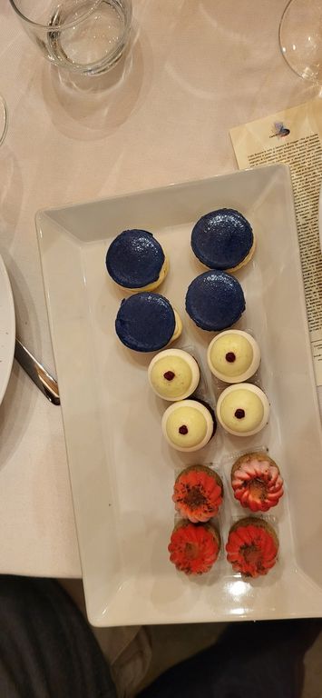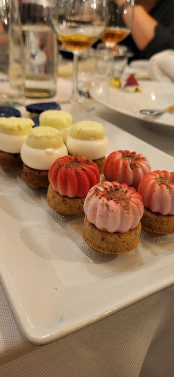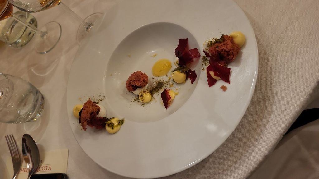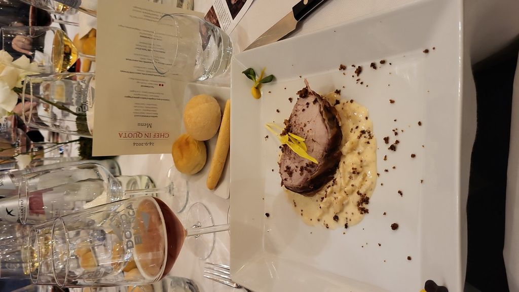 Accomodati a tavola, dopo i saluti e la presentazione degli chef, la cena è stata aperta dall'antipasto di Andrea Ianni della Trattoria Vigezzina (carpaccio di cervo) e seguita dal flan di Bettelmat dallo chef stellato Marco Sacco del Piccolo Lago. Due i primi, cansoncelli di Giancarlo Morelli del Pomiroeu e Riso acquarello di Andrea Pensa dell'Adhoc. Il secondo piatto, un mailaino croccante, è stato proposto dal Gianfranco Tonossi del Divin Porcello mentre il dolce quello di Fabio Tisti dell'omonima pasticceria, con limone, pino e barbabietola e piccola pasticceria, ha chiuso con delicatezza la cena. Numerose le altre aziende che hanno collaborato a Chef in quota, contribuendo a rendere ancora più prestigiosa e unica la serata.