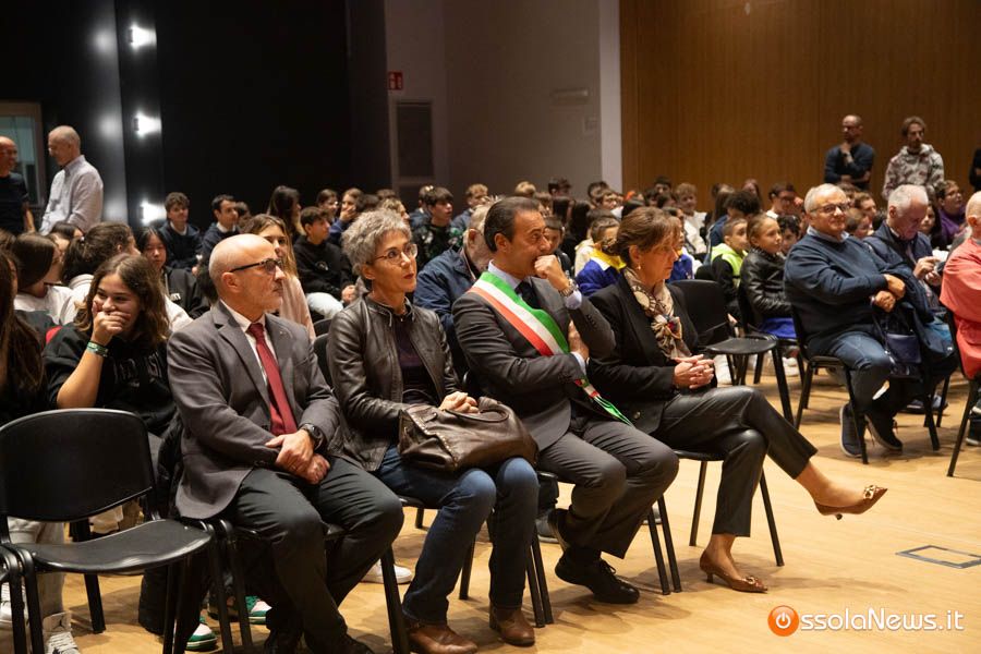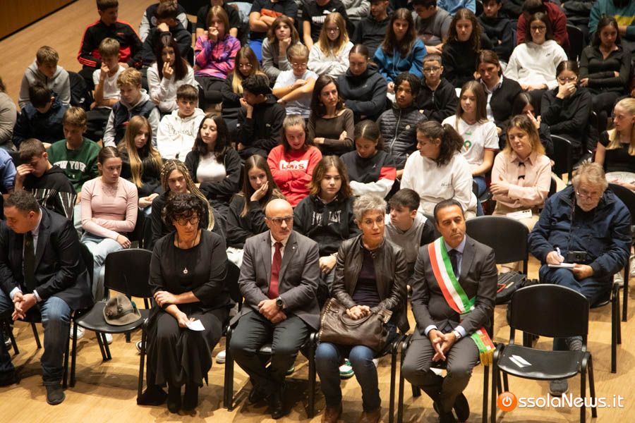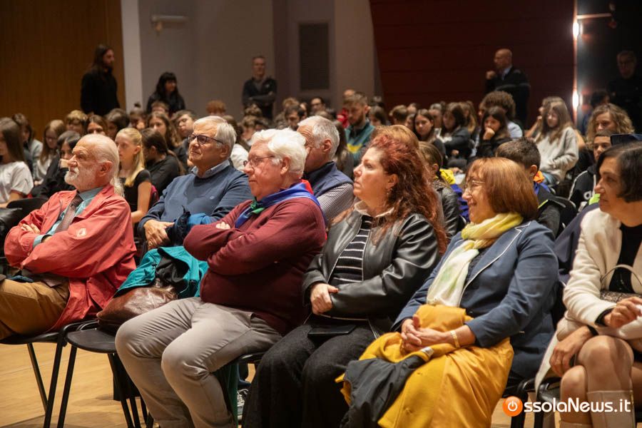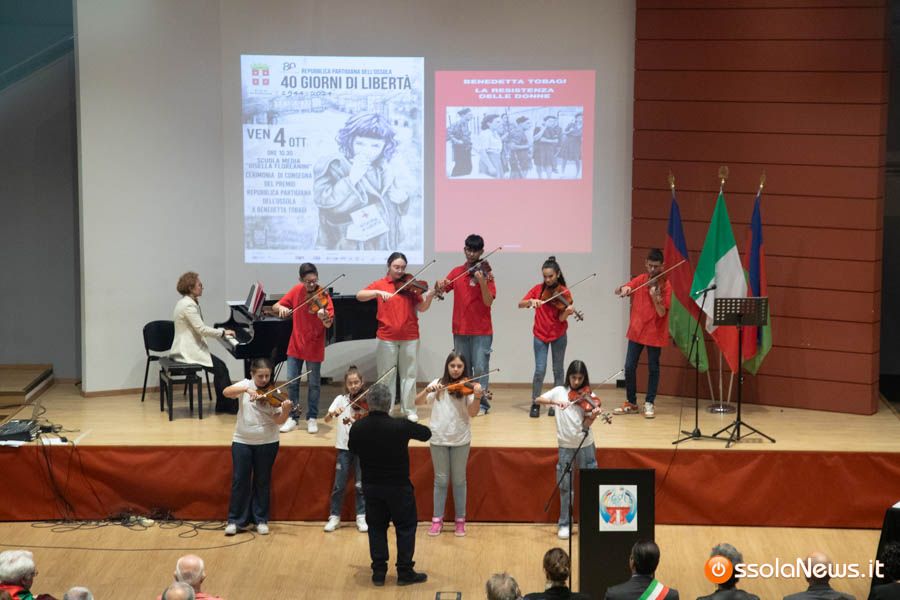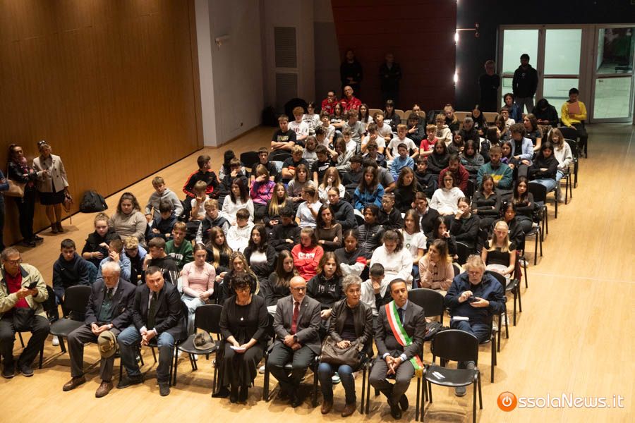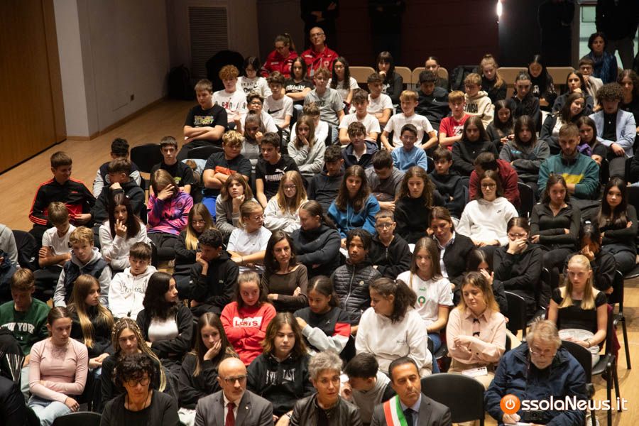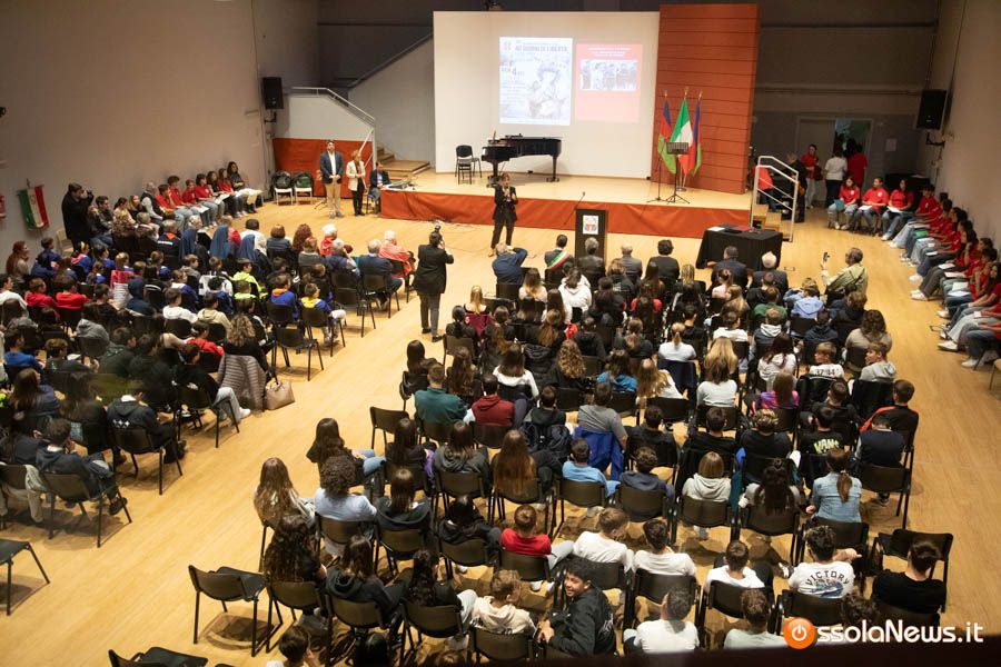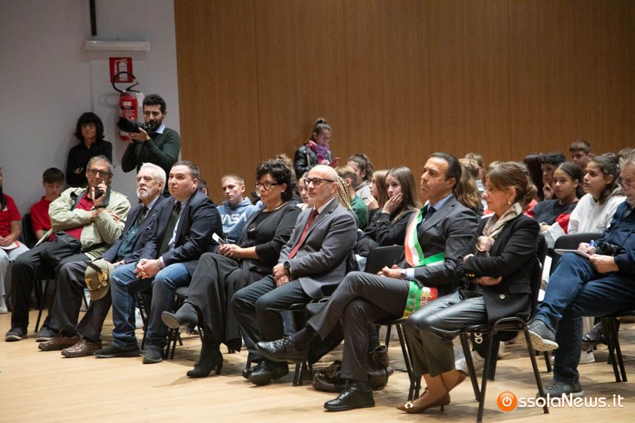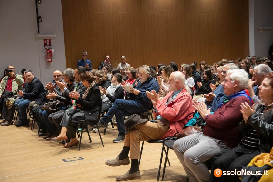 Un’aula magna della scuola media, dicevamo, piena di studenti ed insegnanti per l’importante ricorrenza degli 80 anni dalla Repubblica partigiana. Una cerimonia che ha visto gli studenti recitare alcuni bravi legato alla resistenza e alla condizione della donna nell’era fascista. Letture intervallate da brani musicali proposti da ragazzi e ragazze della scuola domese.