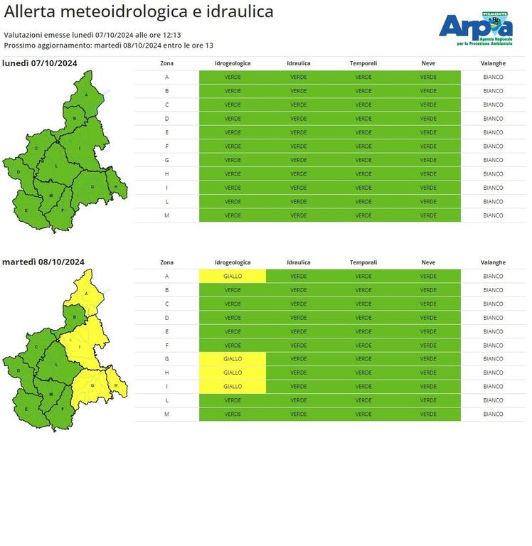 Inoltre, il Centro Funzionale di Arpa Piemonte ha emesso un'allerta gialla per rischio idrogeologico, che riguarderà le province di Asti, Alessandria, Novara e il Verbano, dove si prevedono possibili allagamenti locali e fenomeni di versante isolati. Le piogge forti potrebbero interessare anche le zone di confine delle Alpi Marittime e Liguri, mentre sulle restanti aree le precipitazioni saranno di entità moderata.