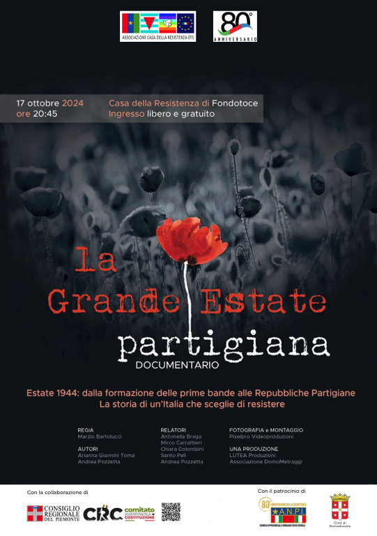 Il 17 ottobre 2024, alle ore 20.45, presso la Casa della Resistenza in Via Turati 9 a Verbania Fondotoce, si terrà la presentazione in anteprima del documentario La grande estate partigiana. Realizzato dal regista Marzio Bartolucci, in collaborazione con gli autori Arianna Giannini Tomà e Andrea Pozzetta, il progetto è frutto della produzione di Lutea e dell'Associazione DomoMetraggi, con fotografia e montaggio a cura di Pixelpro Videoproduzioni.