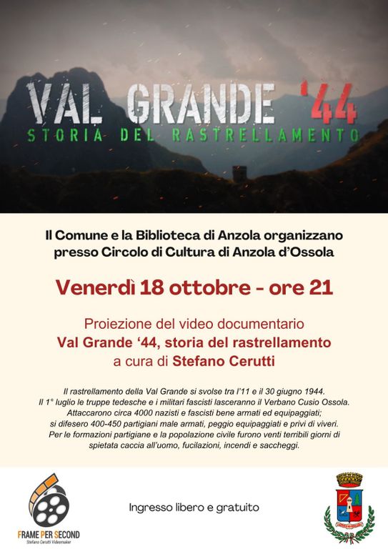 La rassegna ''Il nostro Autunno culturale'' inizierà venerdì 18 ottobre alle ore 21 ad Anzola d'Ossola con la proiezione del docu-film "Val Grande '44" di Stefano Cerutti: storia del Rastrellamento.