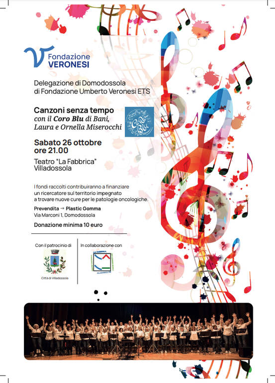 Sabato 26 ottobre 2024, alle ore 21, al teatro “La Fabbrica” di Villadossola, andrà in scena lo spettacolo “Canzoni senza tempo” con la partecipazione del Coro Blu di Bani, e delle cantanti Laura e Ornella Miserocchi. L’iniziativa, patrocinata dalla Città di Villadossola, mira a raccogliere fondi per finanziare un ricercatore impegnato nello sviluppo di nuove terapie contro il cancro. I biglietti sono disponibili in prevendita presso il negozio “Plastic Gomma”, in Via Marconi 1, a Domodossola.