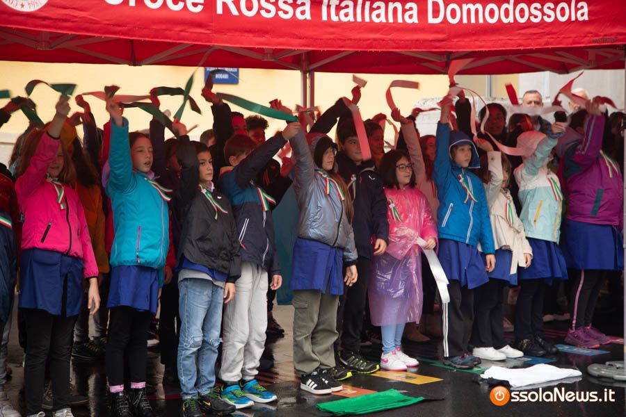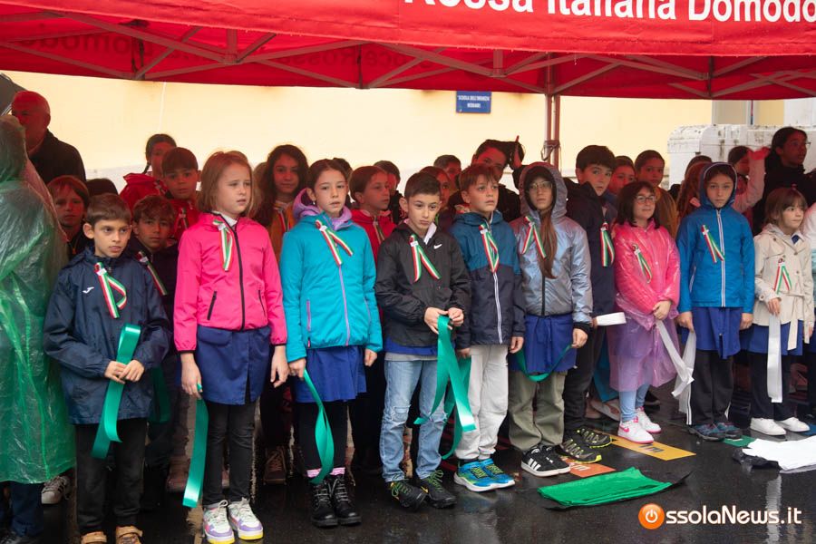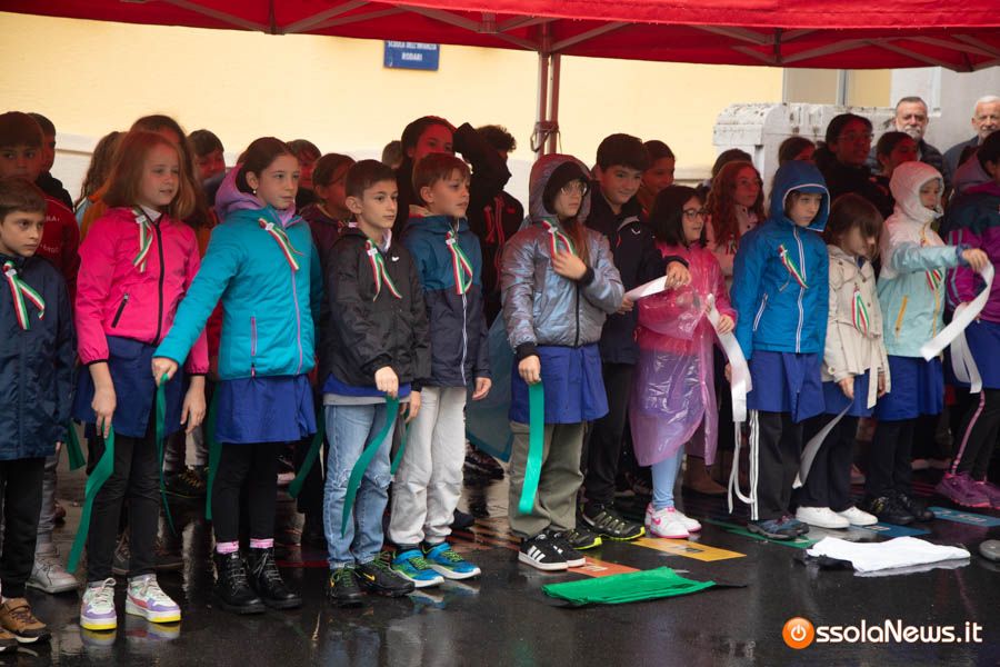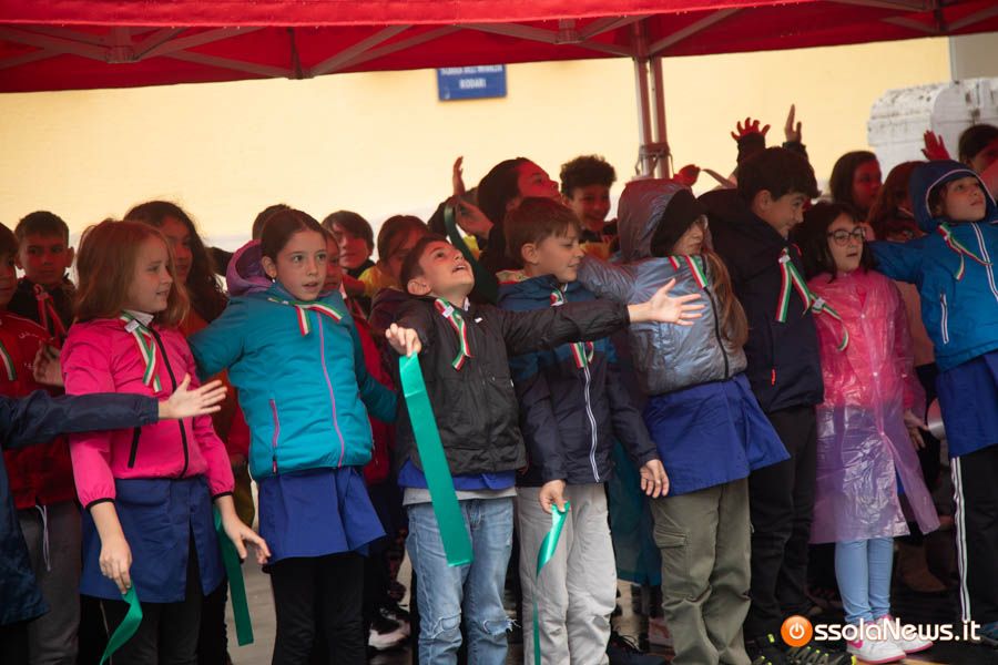 I bambini delle classi quinte hanno accompagnato la cerimonia con alcune canzoni simbolo della Resistenza. Innanzitutto “Quaranta giorni di libertà”, eseguita da Claudia Tori alla voce e Matteo De Giuli alla chitarra, con una coreografia dei bambini. Questi ultimi hanno poi intonato “Verde Ossola” e “Bella Ciao”, per la quale sono stati raggiunti anche dalle classi quarte. Infine, l’inno di Mameli ha concluso l’evento.