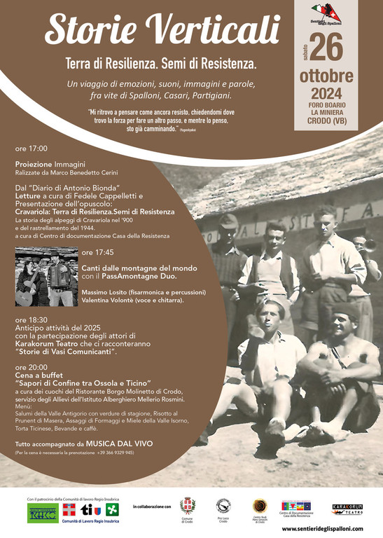 Torna l’appuntamento storie verticali, sabato 26 Ottobre dalle ore 17.00 al Foro Boario La Miniera a Crodo, organizzato dall’Associazione Sentieri degli Spalloni in collaborazione con la Pro Loco, il Comune e Il Centro Studi Piero Ginocchi di Crodo.