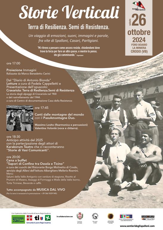 Torna l’appuntamento storie verticali, sabato 26 Ottobre dalle ore 17.00 al Foro Boario La Miniera a Crodo, organizzato dall’Associazione Sentieri degli Spalloni in collaborazione con la Pro Loco, il Comune e Il Centro Studi Piero Ginocchi di Crodo.