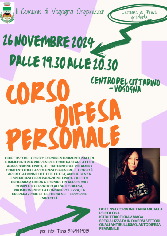 A guidare il corso sarà la dottoresssa Tania Micaela Cordone, psicologa e istruttrice di Krav Maga, con una lunga esperienza in temi legati all'autodifesa femminile e all'antibullismo. La sua esperienza e professionalità offriranno alle partecipanti gli strumenti necessari per affrontare e contrastare situazioni di pericolo con maggiore sicurezza e consapevolezza. Per ulteriori informazioni, è possibile contattare la dottoressa Cordone al numero 3469449083.