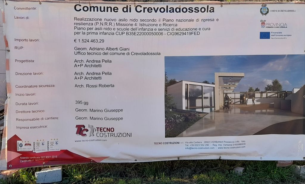 Ha recentemente preso il via il cantiere per la realizzazione nuovo asilo nido comunale di Crevoladossola. “L’opera è completamente finanziata dai fondi Pnrr per una cifra di poco meno di due milioni – spiega il sindaco Giorgio Ferroni -. Il progetto è per una struttura di 900 metri quadrati di superficie, che potrà ospitare fino ad un massimo di 60 bambini. Sarà un servizio nuovo per Crevoladossola e per i comuni limitrofi che andrà a incrementare la qualità dei servizi alle famiglie”.