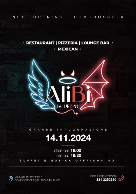 Domodossola è pronta a dare il benvenuto ad Alibi, il nuovo progetto di ristorazione targato Urban, che aprirà ufficialmente le porte domani, giovedì 14 novembre, alle ore 18.00 in via Matilde Ceretti 3. Lo staff attende tutti per un’inaugurazione all’insegna del gusto, con un menù che spazia dalle pizze ai piatti della cucina messicana ma anche hamburgher, primi piatti e tanto altro.