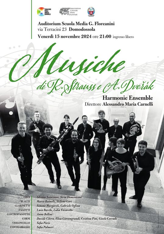 Il termine “Harmonie” in Germania identifica un gruppo di strumenti a fiato e, nello specifico, ricorda il nome della formazione che nel 1784 eseguì per la prima volta la Serenata Gran Partita a Vienna. La formazione che si esibirà a Domodossola venerdì 15 novembre è composta da strumenti a fiato, oltre che contrabbasso e violoncello, suonati da musicisti che hanno collaborato e collaborano attualmente con importanti orchestre sia nazionali che internazionali e che possono vantare una solida esperienza di musica da camera. Svolgono, inoltre, un’intensa attività didattica presso le scuole musicali della provincia del Vco e della vicina Lombardia. Il concerto prevede l'esecuzione di Strauss e Dvořák.