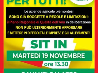L’obiettivo della protesta è quello di evidenziare le forti criticità del Piano regionale di qualità dell’aria in deliberazione che rischia di affossare ulteriormente le imprese. Pur nella consapevolezza della necessaria attenzione all’ambiente, con le misure che si paventano per le imprese agricole, il pericolo è quello di far chiudere migliaia di stalle ed aziende che costituiscono il tessuto economico del Piemonte. In occasione del sit-in verranno illustrati i punti da modificare del Piano di qualità dell’aria e le richieste di Coldiretti Piemonte per la sopravvivenza dell’agricoltura regionale.