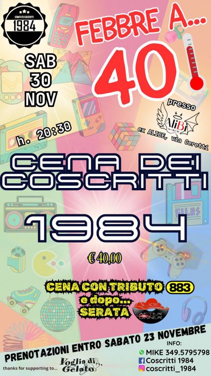 I quarant'anni sono un traguardo importante, e per celebrarlo torna, dopo quindici anni, la cena dei Coscritti del 1984 dell'Ossola. L'appuntamento è per sabato 30 novembre presso l'Alibi di via Ceretti con una serata che prevede la cena con tributo agli 883.