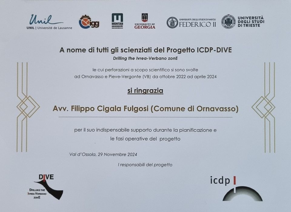 “I professori a capo del progetto hanno voluto ringraziare la nostra comunità – sottolinea il sindaco - per il sostegno e l'interesse dimostrato donandoci anche un pezzo della Ornavasso profonda, quella per intenderci che data tra i 200 ed i 300 milioni di anni fa. Ovviamente la conserveremo con cura ma questa esperienza e tutte le conseguenti scoperte saranno valorizzate anche attraverso il Geoparco di cui Ornavasso, a buon titolo, fa parte”.