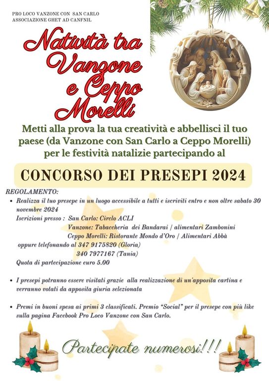 Come da tradizione, anche per il 2024, verrà organizzato il concorso dei presepi intitolato “Natività tra Vanzone e Ceppo Morelli” che ha l’obiettivo di mettere alla prova la creatività dei partecipanti e di abbellire i paesi di Vanzone con San Carlo e di Ceppo Morelli durante le festività natalizie.