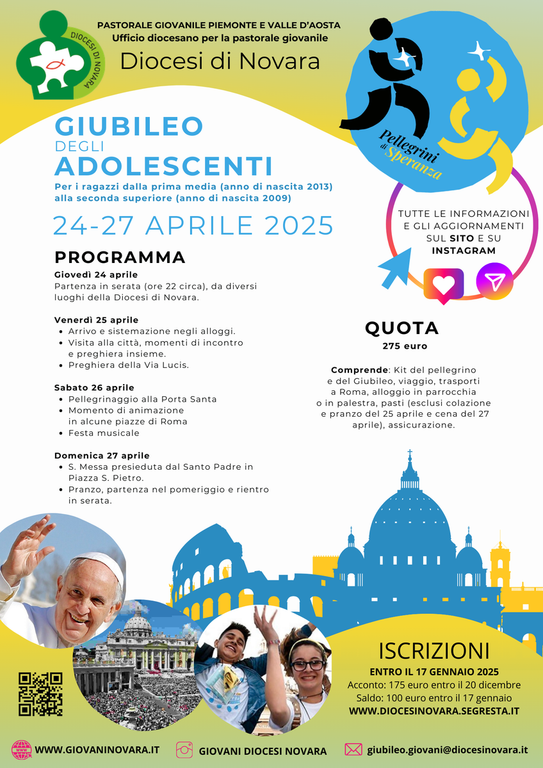 L'inizio dell'avventura è previsto per la serata di giovedì 24 aprile, quando i gruppi partiranno da vari luoghi della Diocesi di Novara, pronti a vivere insieme un viaggio che promette momenti di riflessione, preghiera e condivisione. All’arrivo a Roma, venerdì 25 aprile, i partecipanti saranno accolti, sistemati negli alloggi e coinvolti in una serie di attività, tra cui la visita alla città e la Preghiera della Via Lucis, un momento intenso di spiritualità che unisce giovani provenienti da tutta Italia.