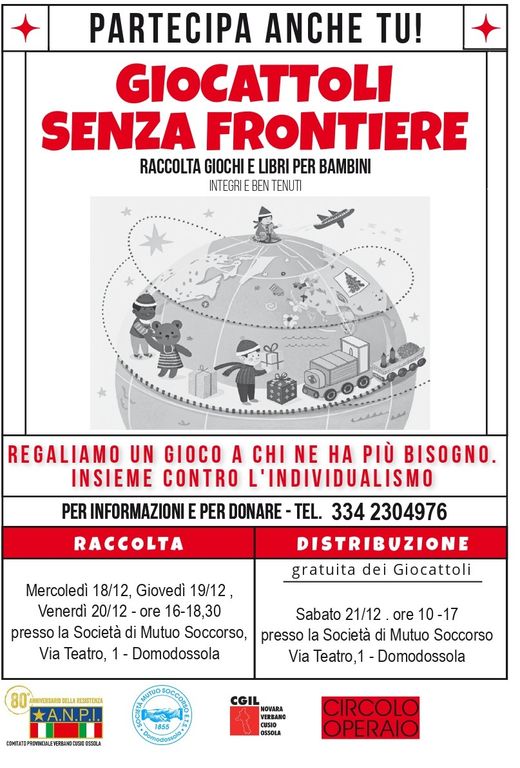 In occasione del Natale, i volontari del Circolo Operaio, in collaborazione con CGIL Novara e VCO, ANPI e la Società di Mutuo Soccorso ETS di Domodossola, lanciano un’iniziativa solidale per regalare un sorriso ai bambini più bisognosi. Una raccolta di giocattoli e libri per l’infanzia è stata organizzata nei giorni 18, 19 e 20 dicembre, dalle ore 16:00 alle 18:30, presso la sede della S.M.S. ETS in Via Teatro 1, a Domodossola.