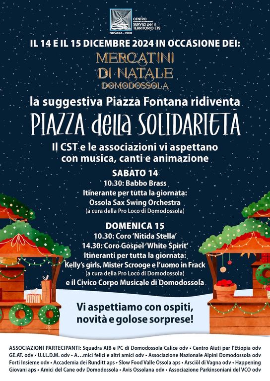 Un Natale all’insegna della generosità e della condivisione: torna la Piazza della Solidarietà nel cuore dei mercatini natalizi di Domodossola. L’iniziativa, promossa dal Centro Servizi per il Territorio Novara-Vco in collaborazione con la Pro Loco domese, trasformerà Piazza Fontana in uno spazio dedicato al volontariato locale.