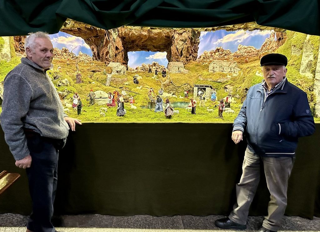 Statuine che “vestono” gli abiti tradizionali vigezzini, il paesello attraversato dal fiume con l'acqua corrente, le luci che riproducono il paesaggio tra giorno e notte con un emozionante tramonto. E poi il particolare effetto di profondità realizzato grazie a un accorto gioco di specchi che ne amplia le vedute. Ormai non è più un segreto: Ezio e Felice - due maleschesi di 84 e 75 anni, che da oltre sessant'anni si occupano della realizzazione del presepe - posizionano sapientemente gli specchi che, con i loro riflessi, ampliano i contorni del presepe dando l'impressione che sia molto più grande.