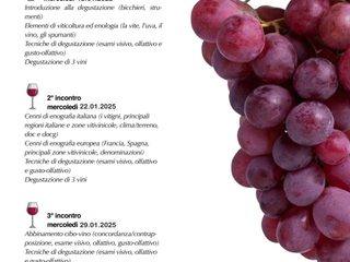 Le date di questa edizione saranno: mercoledì 15, 22 e 29 gennaio 2025, dalle 20.30 alle 22.30. Ogni serata comprenderà una parte teorica in cui verranno toccati elementi di viticoltura ed enologia (la vite, l’uva, il vino, gli spumanti) e verranno fatti cenni all’enografia italiana ed europea, ed una parte pratica con la degustazione di 3 vini scelti e forniti da Ais Verbania.