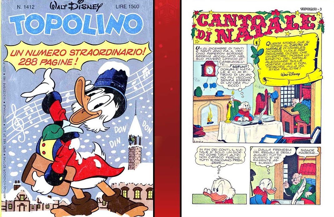 Topolino, sia nella testata principale, sia nelle varie pubblicazioni satelliti, ha sempre festeggiato in qualche modo il Natale, tanto nelle storie quanto nelle rubriche, ma c’è una storia in particolare che è rimasta nel ricordo dei lettori più affezionati, ovvero la rivisitazione de “Il Canto di Natale” di Charles Dickens. L’avaro protagonista della vicenda è stato interpretato in quell’occasione da… Indovinate un po’? E’ avvenuto nel numero 1412 di Topolino, del dicembre 1982. Paperon Scrooge incontra, nella storia scritta da Guido Martina e disegnata da José Colomer Fonts, i fantasmi del Natale passato, di quello presente e di quello futuro, comprende i suoi errori e si redime, proprio come accade nel racconto del celebre autore inglese.