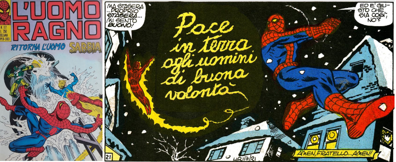 Non possono mancare in questo elenco i natali dei supereroi. Per la Marvel ne citiamo uno su tutti, un po’ vecchiotto, ma probabilmente il più bello; quello che l’Uomo Ragno (all’epoca, in Italia, nessuno lo chiamava Spider-Man) e la Torcia Umana dei Fantastici 4 vivono insieme all’Uomo Sabbia nel numero 117 dell’Uomo Ragno Editoriale Corno. L’albo uscì con un po’ di anticipo rispetto alle festività, era l’ottobre del 1974. Una storia avvincente, carica di pathos, in cui senza retorica, per una volta, il buono concede il perdono al cattivo. Quest’ultimo ne approfitta, ma non fa nulla, perché per gli uomini di buona volontà il Natale è un giorno speciale.