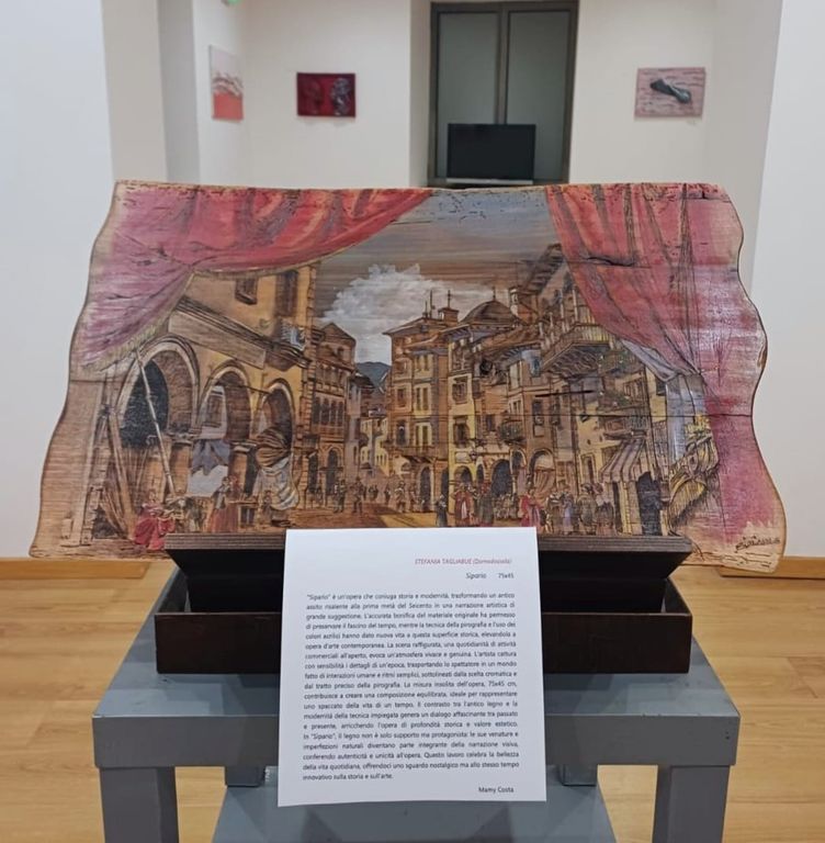 La curatrice della mostra, Domenica Costa, ha personalmente redatto una dettagliata presentazione del dipinto, definito "un'opera d'arte contemporanea", evidenziandone la qualità artistica e la particolarità della sua realizzazione a pirografo su tavole di legno antico, rifinita poi con colori acrilici. Il soggetto dell'opera è il famoso sipario del teatro Galletti di Domodossola, attualmente esposto presso i Musei Civici Galletti a Palazzo san Francesco.